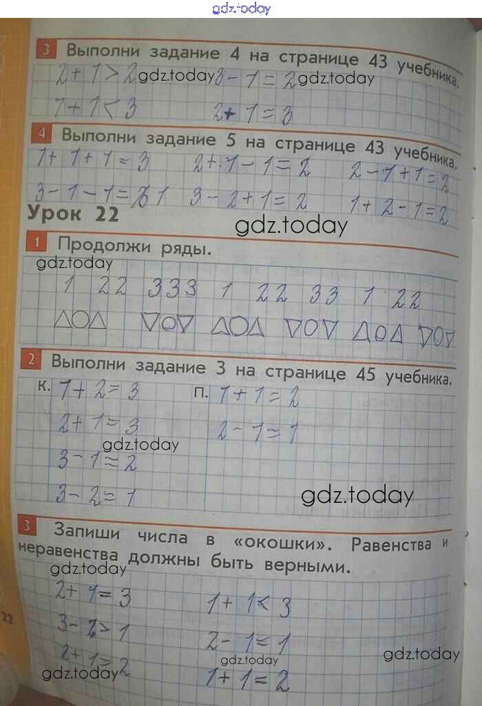 На страницах сайта gdz.today вы найдете учебный и вспомогательный материал, направленный на улучшения знаний школьной программы. ГДЗ - онлайн мир знаний Страницы (решение) 22 Рабочей тетради по Математике для 1 класса Демидова, Козлова Баласс Школа 2100 2015