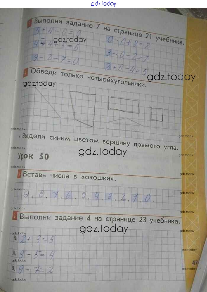 На страницах сайта gdz.today вы найдете учебный и вспомогательный материал, направленный на улучшения знаний школьной программы. ГДЗ - онлайн мир знаний Страницы (решение) 47 Рабочей тетради по Математике для 1 класса Демидова, Козлова Баласс Школа 2100 2015