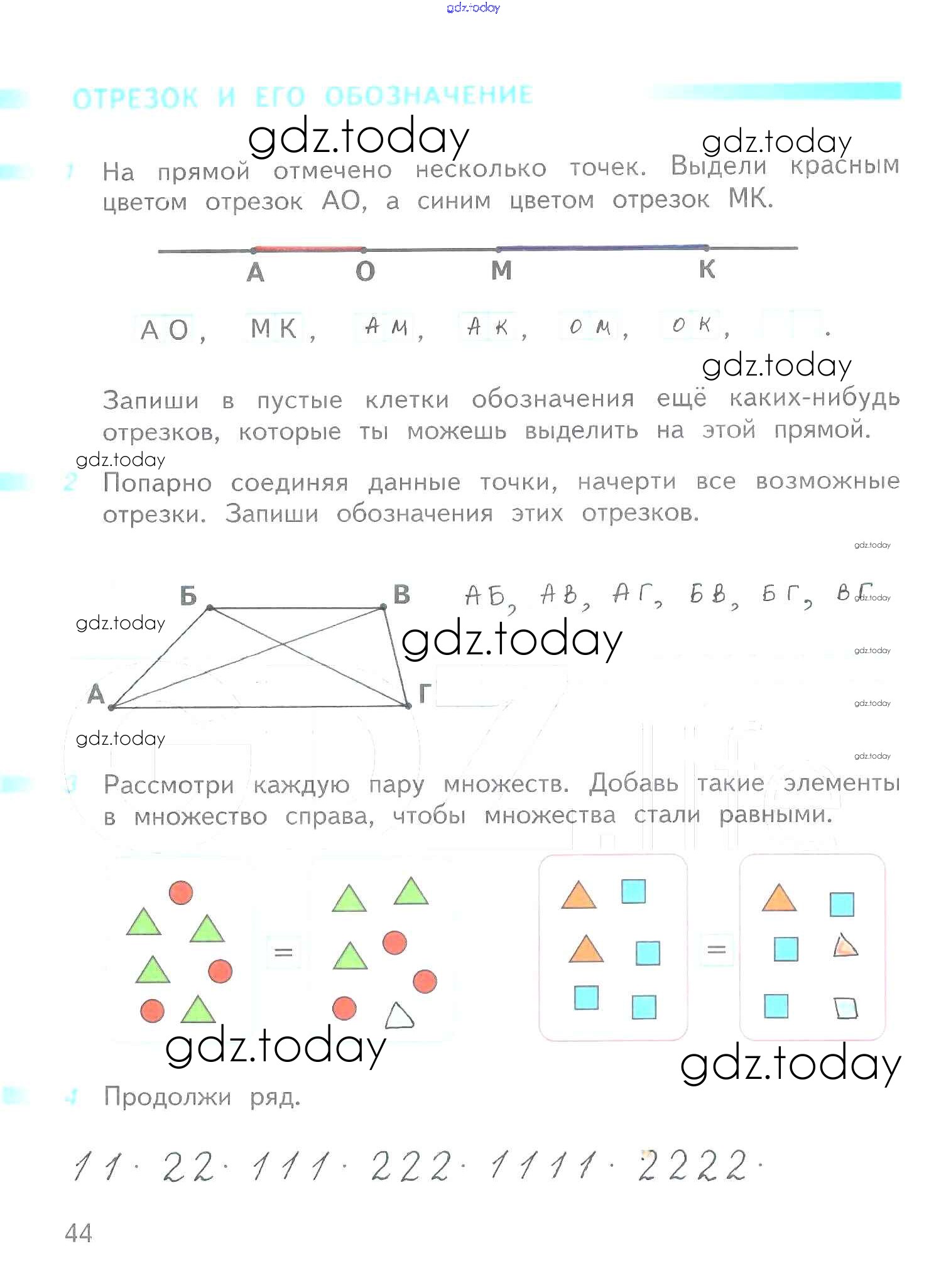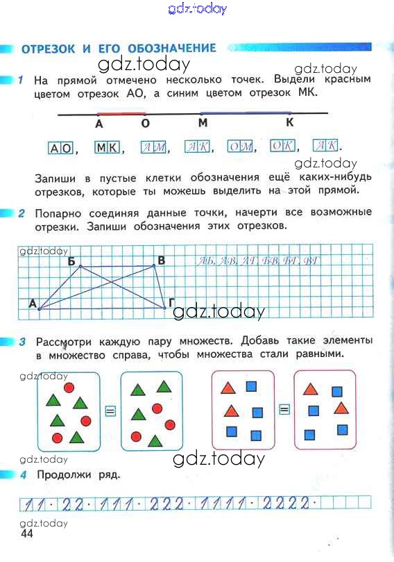На страницах сайта gdz.today вы найдете учебный и вспомогательный материал, направленный на улучшения знаний школьной программы. ГДЗ - онлайн мир знаний Решение к части 1 (страницы) 44 Рабочей тетради по Математике для 1 класса Дорофеев, Миракова Просвещение Перспектива 2016