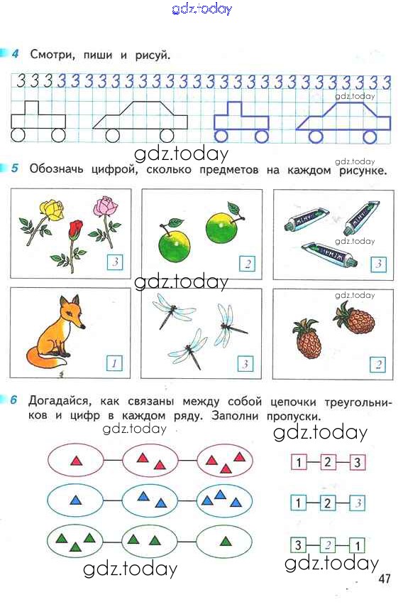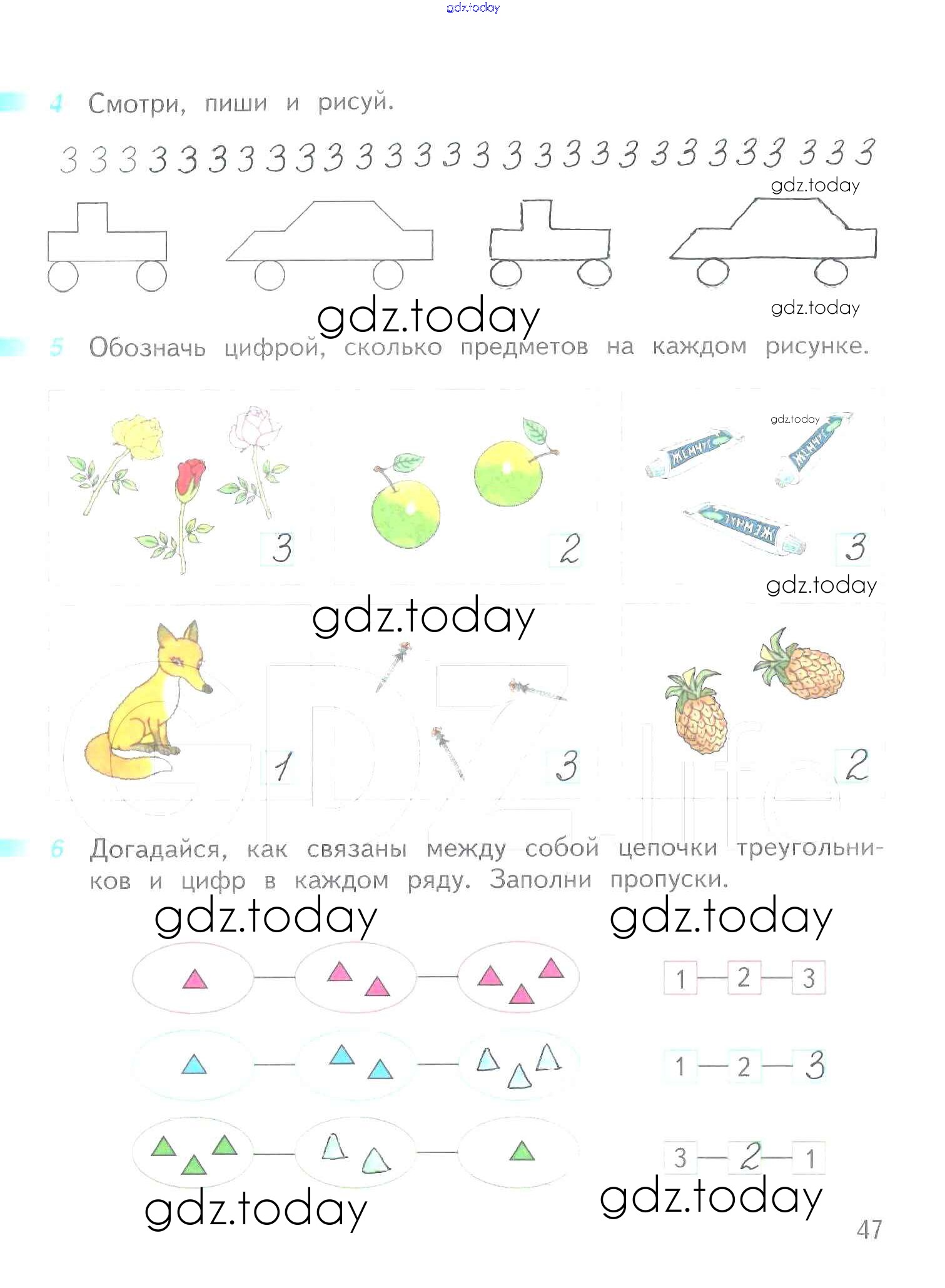 На страницах сайта gdz.today вы найдете учебный и вспомогательный материал, направленный на улучшения знаний школьной программы. ГДЗ - онлайн мир знаний Решение к части 1 (страницы) 47 Рабочей тетради по Математике для 1 класса Дорофеев, Миракова Просвещение Перспектива 2016