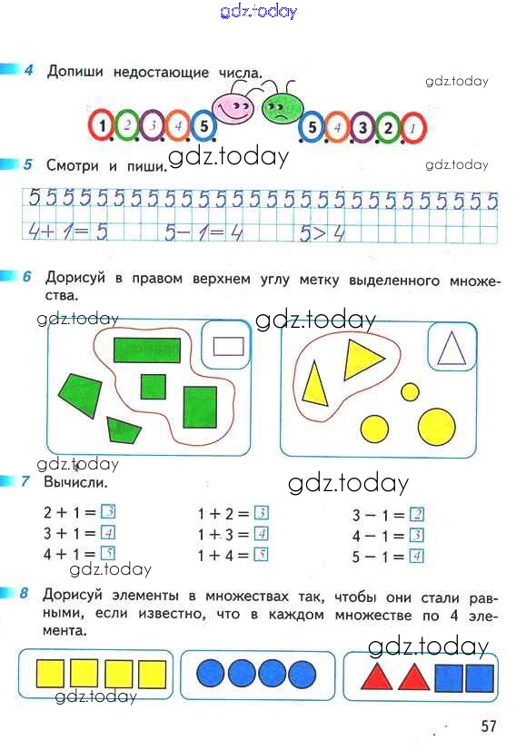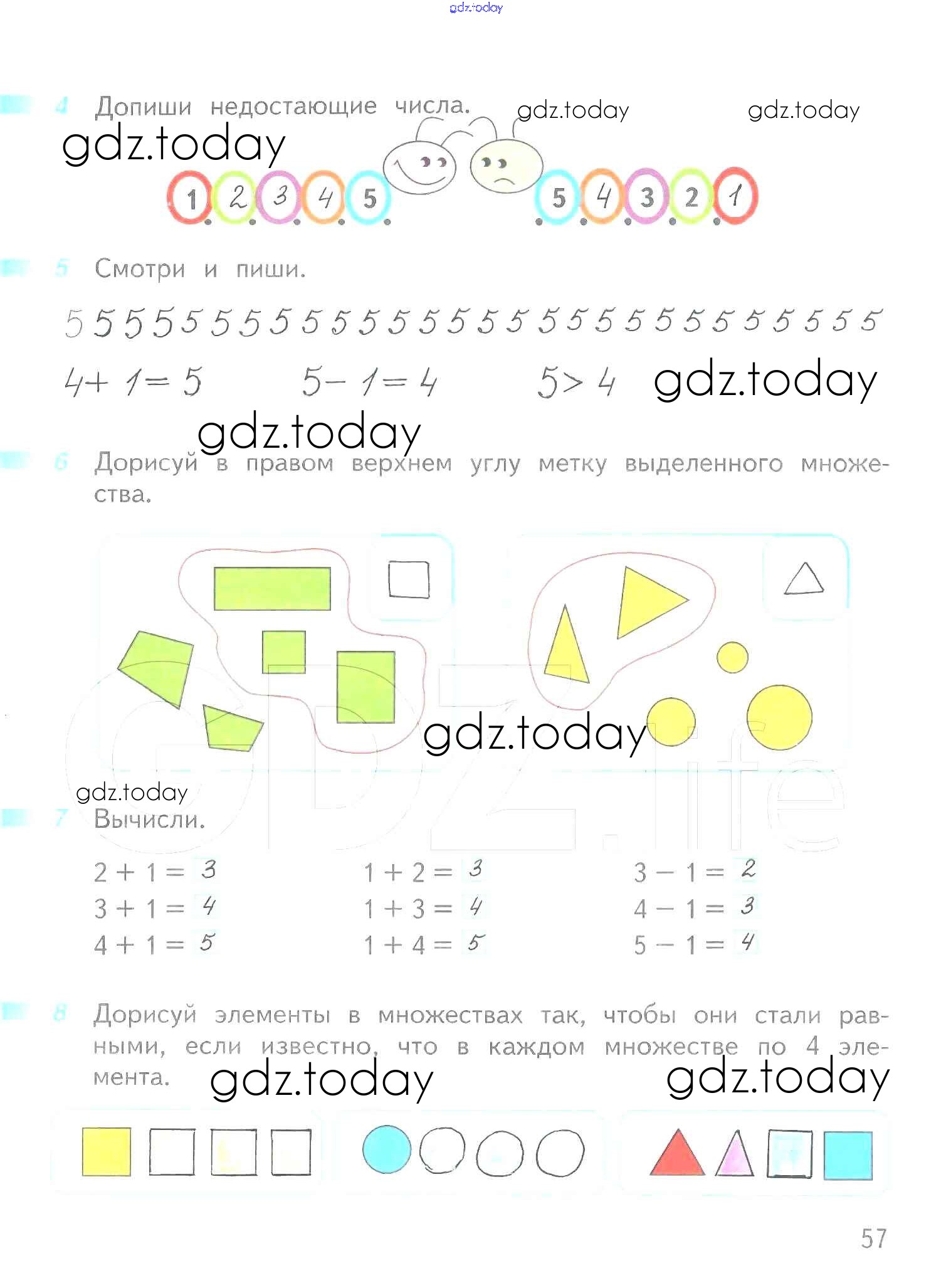 На страницах сайта gdz.today вы найдете учебный и вспомогательный материал, направленный на улучшения знаний школьной программы. ГДЗ - онлайн мир знаний Решение к части 1 (страницы) 57 Рабочей тетради по Математике для 1 класса Дорофеев, Миракова Просвещение Перспектива 2016