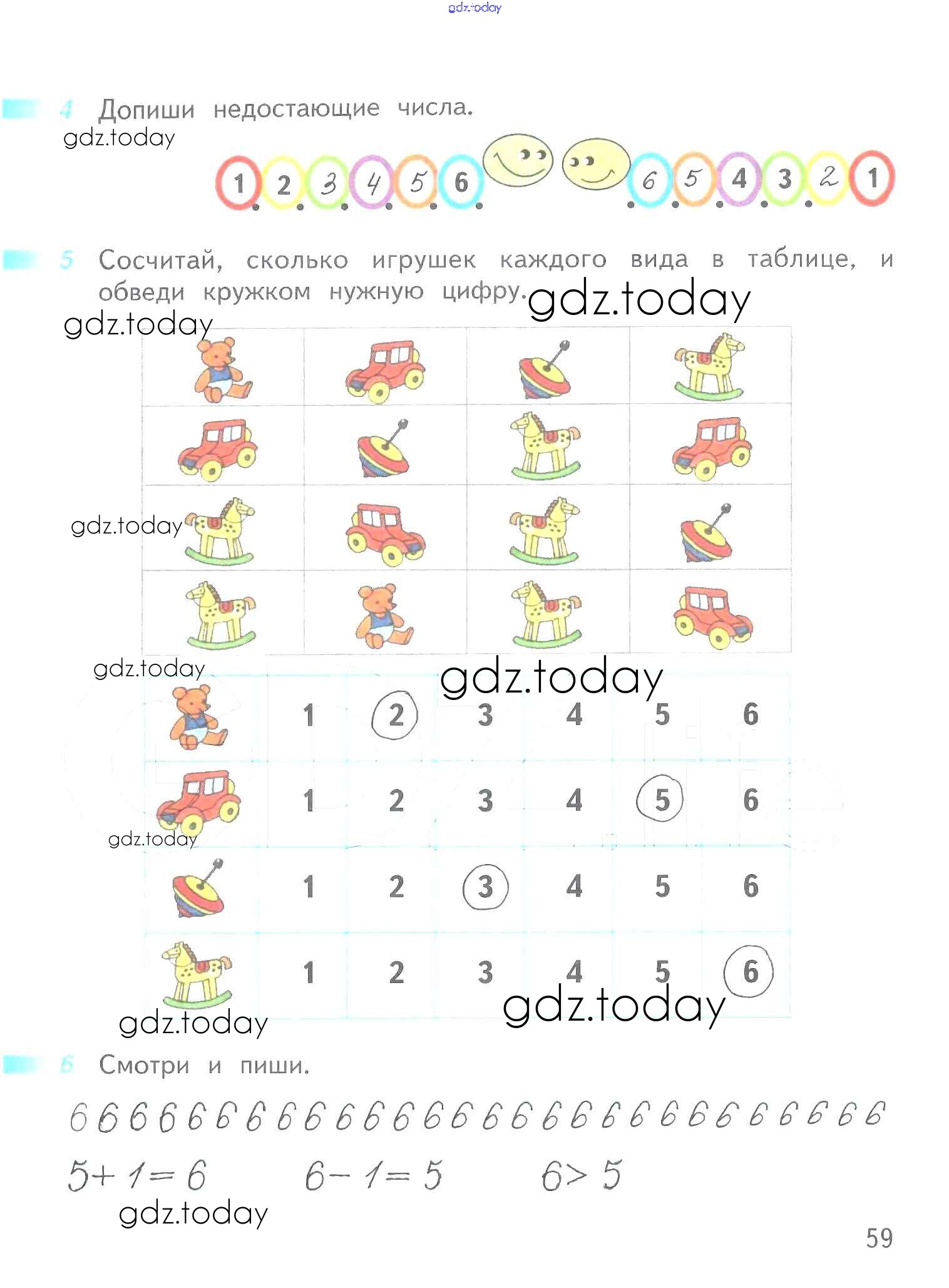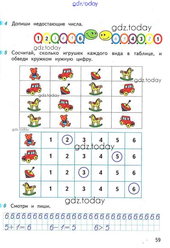 На страницах сайта gdz.today вы найдете учебный и вспомогательный материал, направленный на улучшения знаний школьной программы. ГДЗ - онлайн мир знаний Решение к части 1 (страницы) 59 Рабочей тетради по Математике для 1 класса Дорофеев, Миракова Просвещение Перспектива 2016