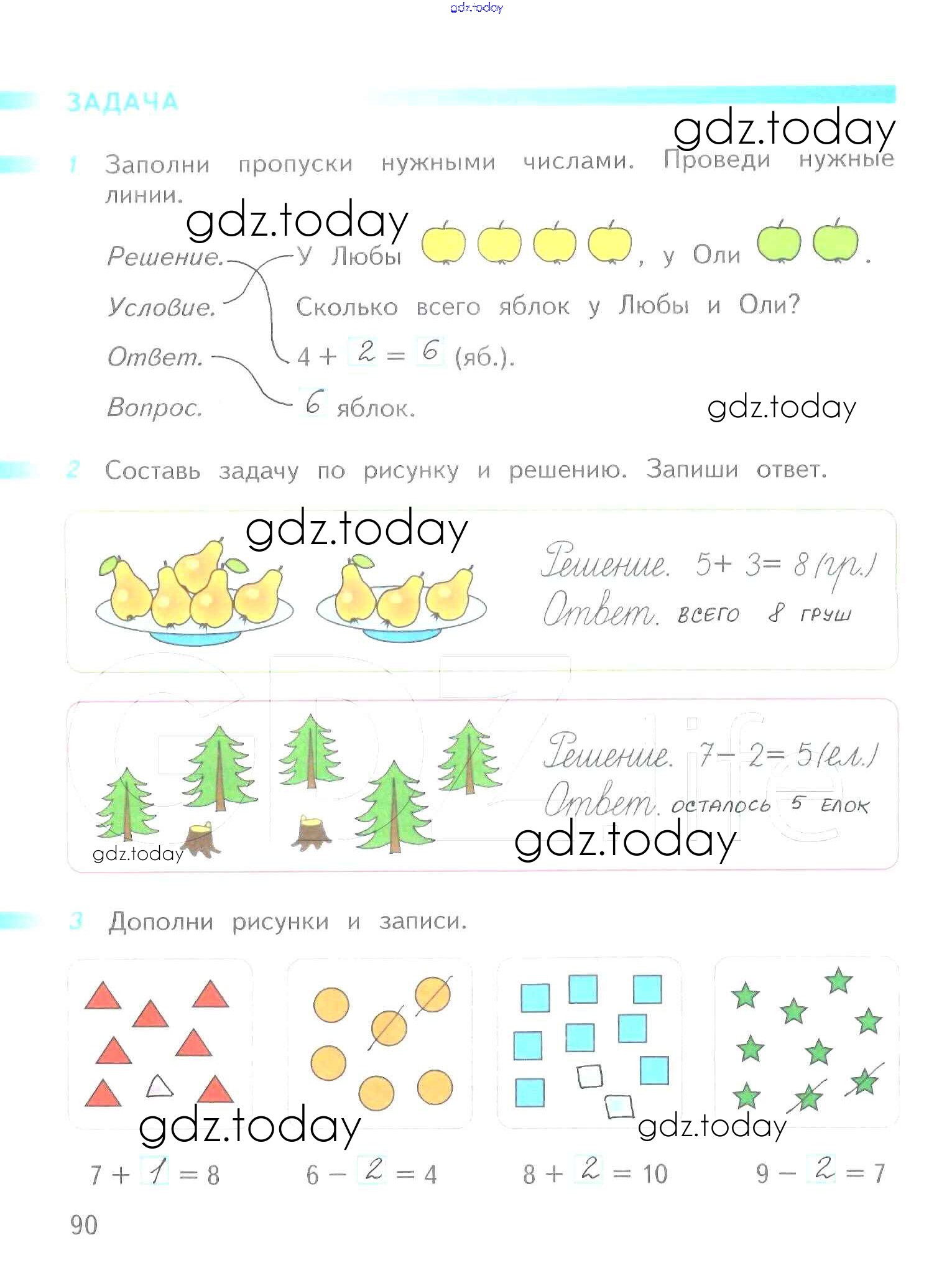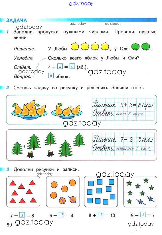На страницах сайта gdz.today вы найдете учебный и вспомогательный материал, направленный на улучшения знаний школьной программы. ГДЗ - онлайн мир знаний Решение к части 1 (страницы) 90 Рабочей тетради по Математике для 1 класса Дорофеев, Миракова Просвещение Перспектива 2016