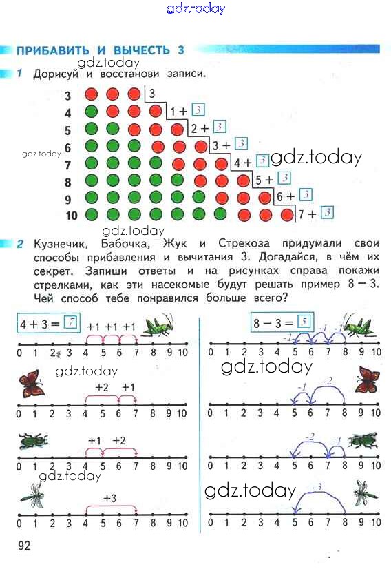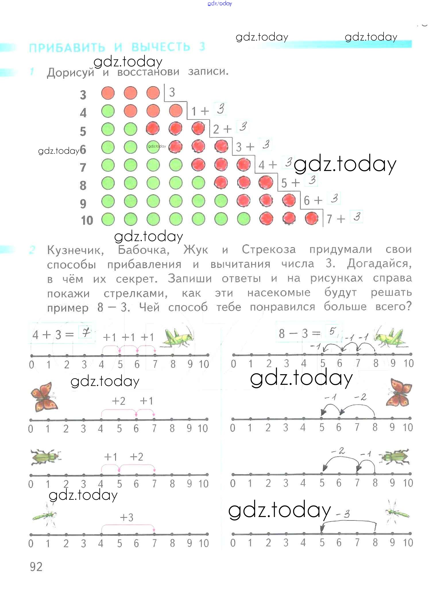 На страницах сайта gdz.today вы найдете учебный и вспомогательный материал, направленный на улучшения знаний школьной программы. ГДЗ - онлайн мир знаний Решение к части 1 (страницы) 92 Рабочей тетради по Математике для 1 класса Дорофеев, Миракова Просвещение Перспектива 2016