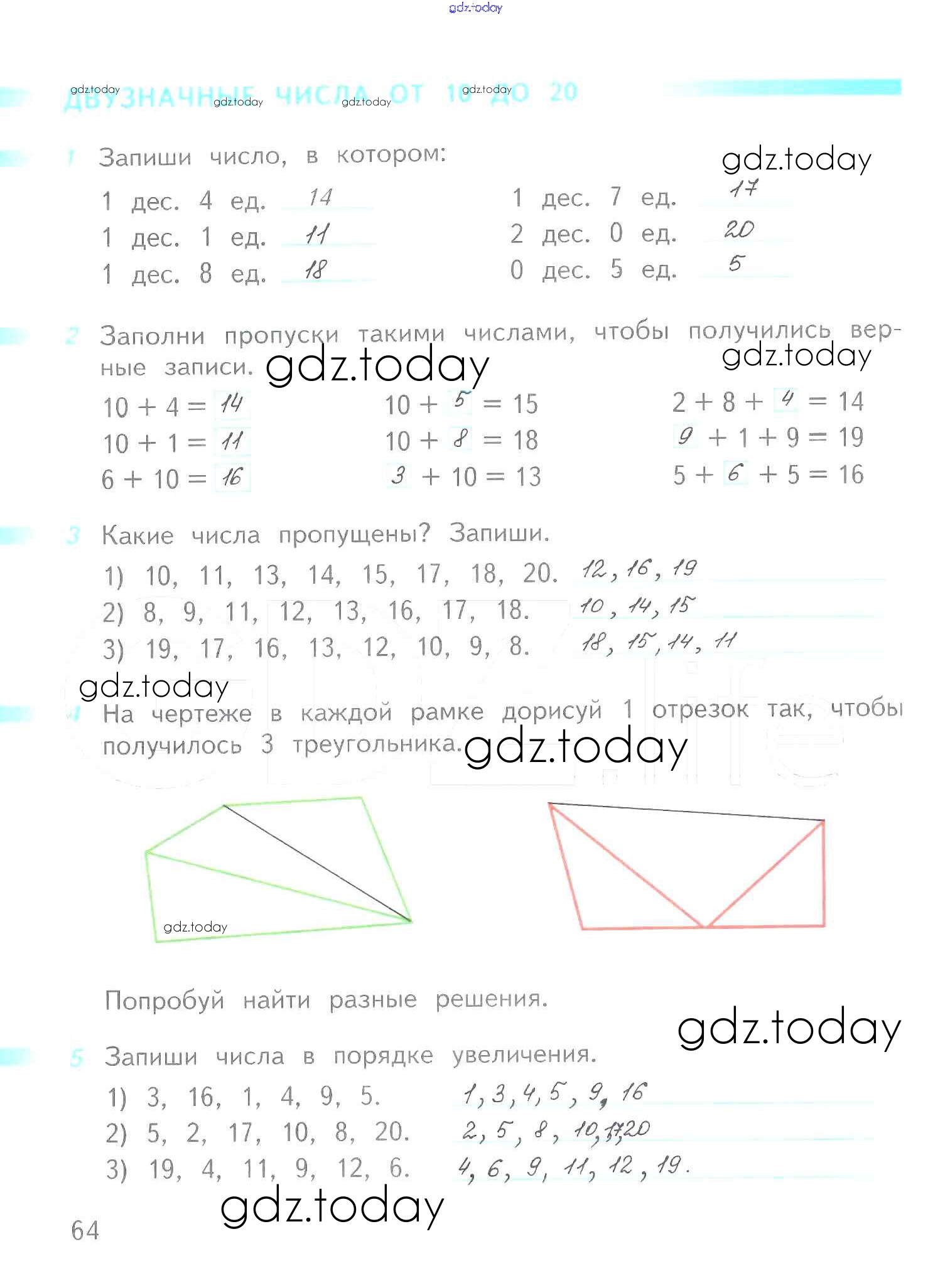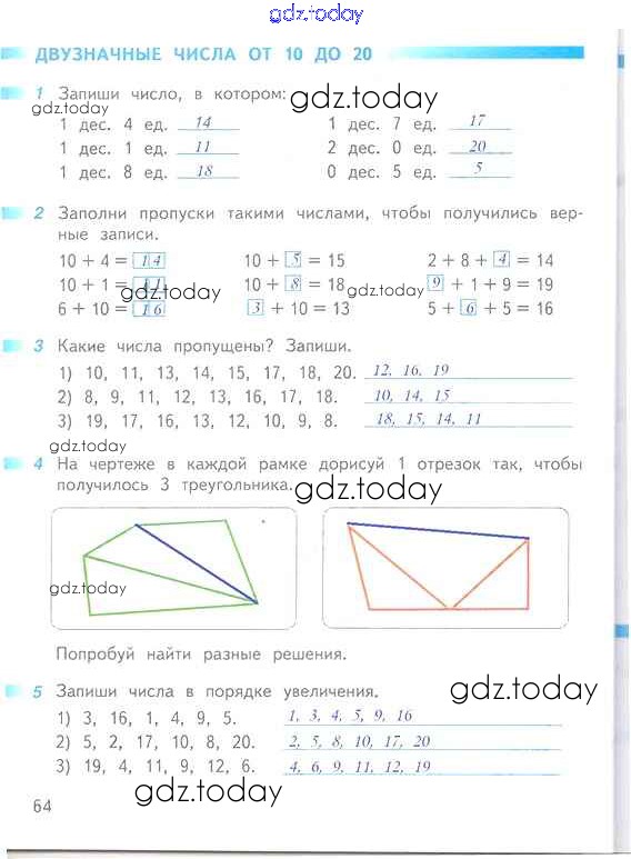 На страницах сайта gdz.today вы найдете учебный и вспомогательный материал, направленный на улучшения знаний школьной программы. ГДЗ - онлайн мир знаний Решение к части 2 (страницы) 64 Рабочей тетради по Математике для 1 класса Дорофеев, Миракова Просвещение Перспектива 2016