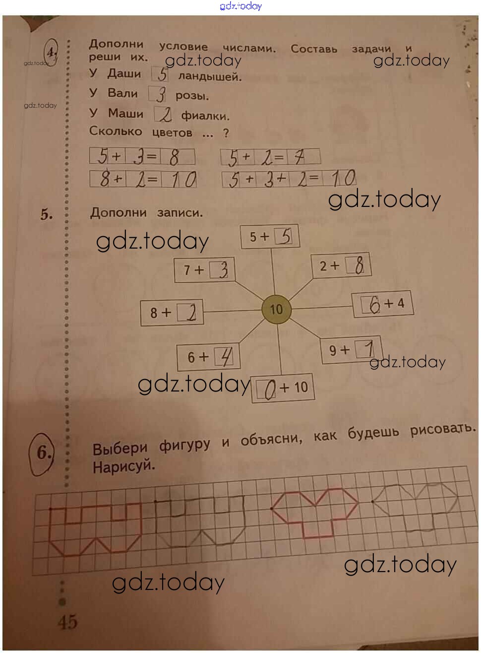 На страницах сайта gdz.today вы найдете учебный и вспомогательный материал, направленный на улучшения знаний школьной программы. ГДЗ - онлайн мир знаний Решение к части 2. Страницы 45 Рабочей тетради по Математике для 1 класса Кочурова Вентана-граф Начальная школа XXI века 2020