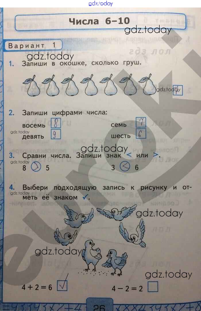 На страницах сайта gdz.today вы найдете учебный и вспомогательный материал, направленный на улучшения знаний школьной программы. ГДЗ - онлайн мир знаний Решение к части 1. Страницы 26 Контрольным работам по Математике для 1 класса Рудницкая Экзамен УМК 2014