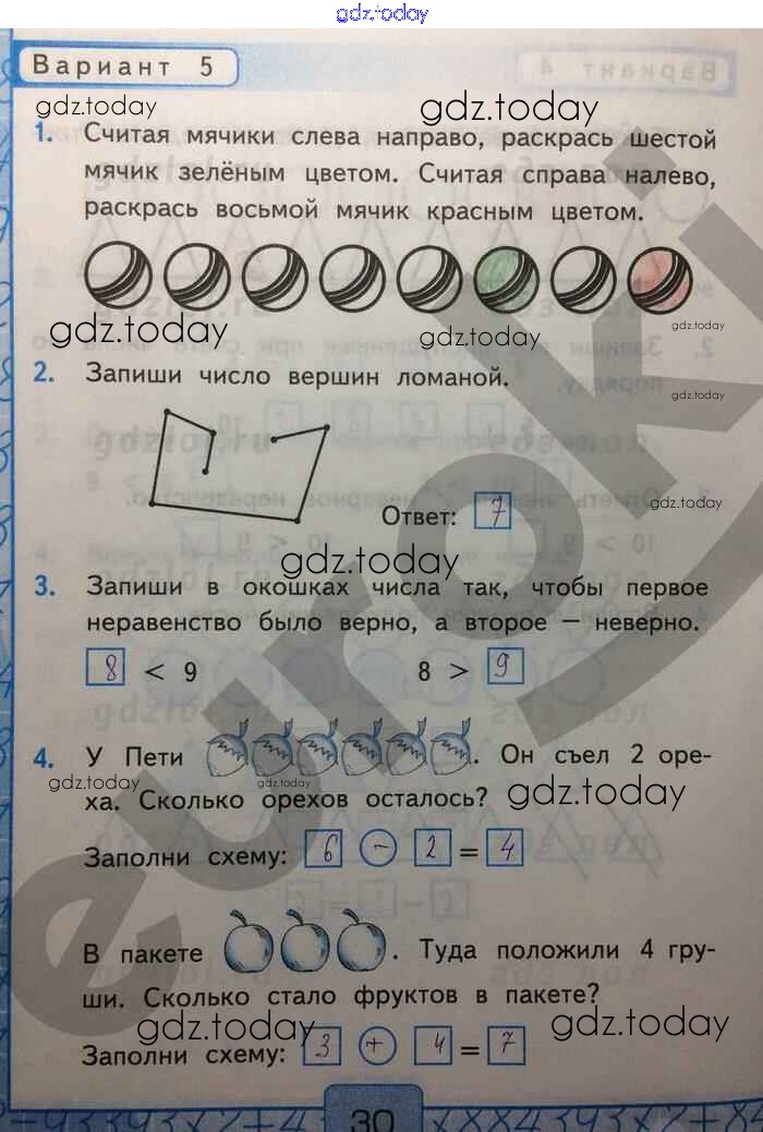 На страницах сайта gdz.today вы найдете учебный и вспомогательный материал, направленный на улучшения знаний школьной программы. ГДЗ - онлайн мир знаний Решение к части 1. Страницы 30 Контрольным работам по Математике для 1 класса Рудницкая Экзамен УМК 2014