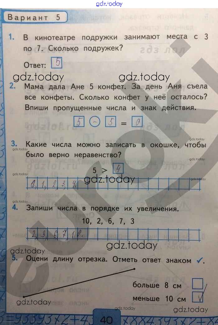 На страницах сайта gdz.today вы найдете учебный и вспомогательный материал, направленный на улучшения знаний школьной программы. ГДЗ - онлайн мир знаний Решение к части 1. Страницы 40 Контрольным работам по Математике для 1 класса Рудницкая Экзамен УМК 2014