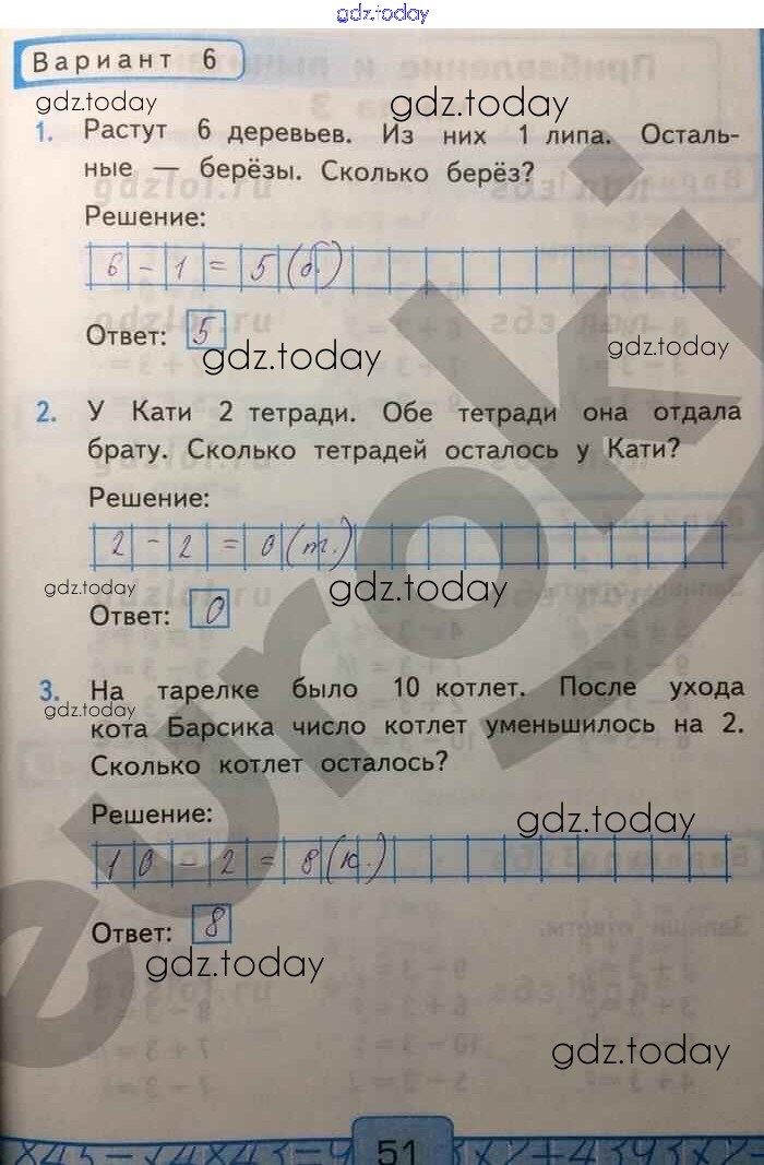 Ответы к Решение к части 1. Страницы 51 Контрольным работам по Математике для 1 класса Рудницкая Экзамен УМК 2014
