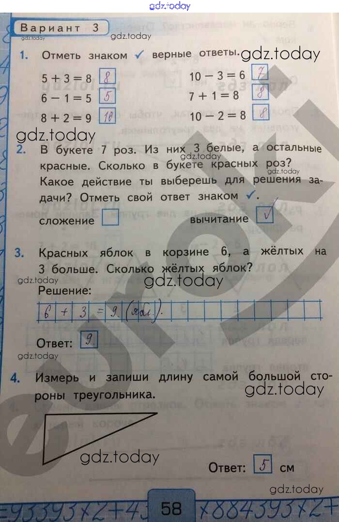 На страницах сайта gdz.today вы найдете учебный и вспомогательный материал, направленный на улучшения знаний школьной программы. ГДЗ - онлайн мир знаний Решение к части 1. Страницы 58 Контрольным работам по Математике для 1 класса Рудницкая Экзамен УМК 2014