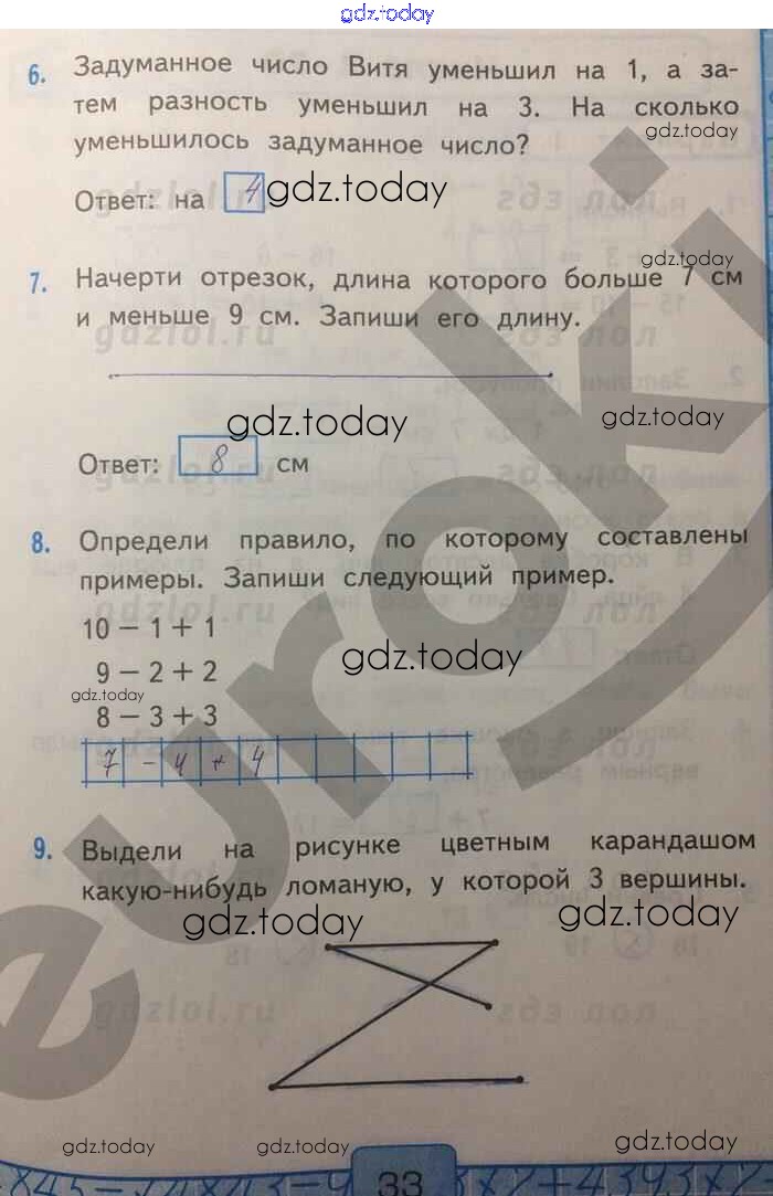 На страницах сайта gdz.today вы найдете учебный и вспомогательный материал, направленный на улучшения знаний школьной программы. ГДЗ - онлайн мир знаний Решение к части 2. Страницы 33 Контрольным работам по Математике для 1 класса Рудницкая Экзамен УМК 2014