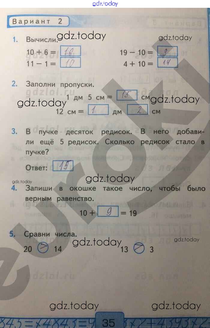 На страницах сайта gdz.today вы найдете учебный и вспомогательный материал, направленный на улучшения знаний школьной программы. ГДЗ - онлайн мир знаний Решение к части 2. Страницы 35 Контрольным работам по Математике для 1 класса Рудницкая Экзамен УМК 2014