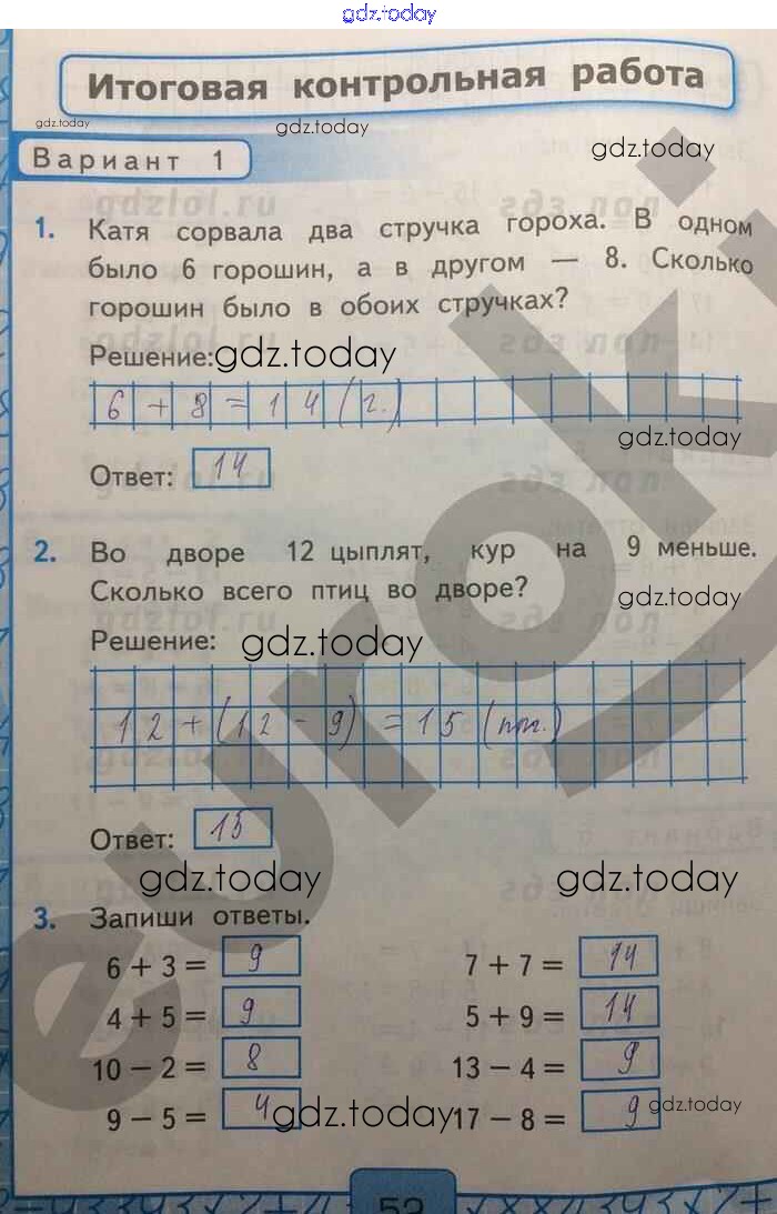 На страницах сайта gdz.today вы найдете учебный и вспомогательный материал, направленный на улучшения знаний школьной программы. ГДЗ - онлайн мир знаний Решение к части 2. Страницы 52 Контрольным работам по Математике для 1 класса Рудницкая Экзамен УМК 2014