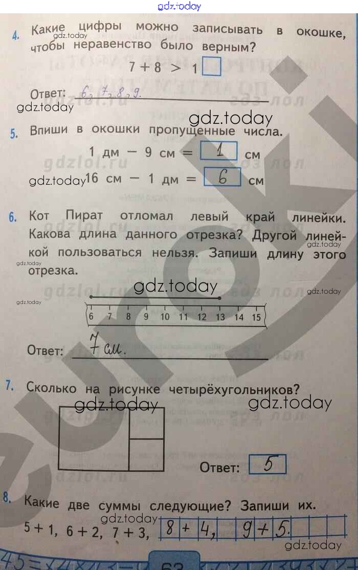 На страницах сайта gdz.today вы найдете учебный и вспомогательный материал, направленный на улучшения знаний школьной программы. ГДЗ - онлайн мир знаний Решение к части 2. Страницы 63 Контрольным работам по Математике для 1 класса Рудницкая Экзамен УМК 2014