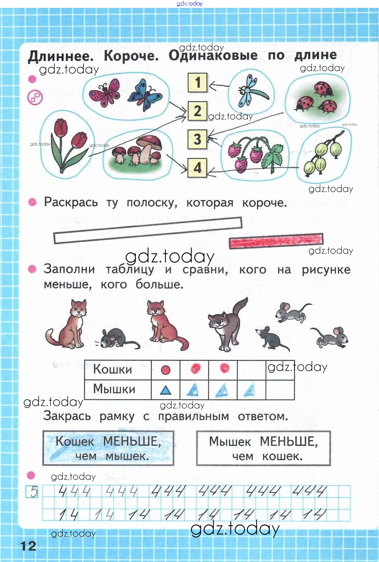 На страницах сайта gdz.today вы найдете учебный и вспомогательный материал, направленный на улучшения знаний школьной программы. ГДЗ - онлайн мир знаний Решение к части 1 (Страницы) 12 Рабочей тетради по Математике для 1 класса Моро, Волкова Просвещение Школа России 2016