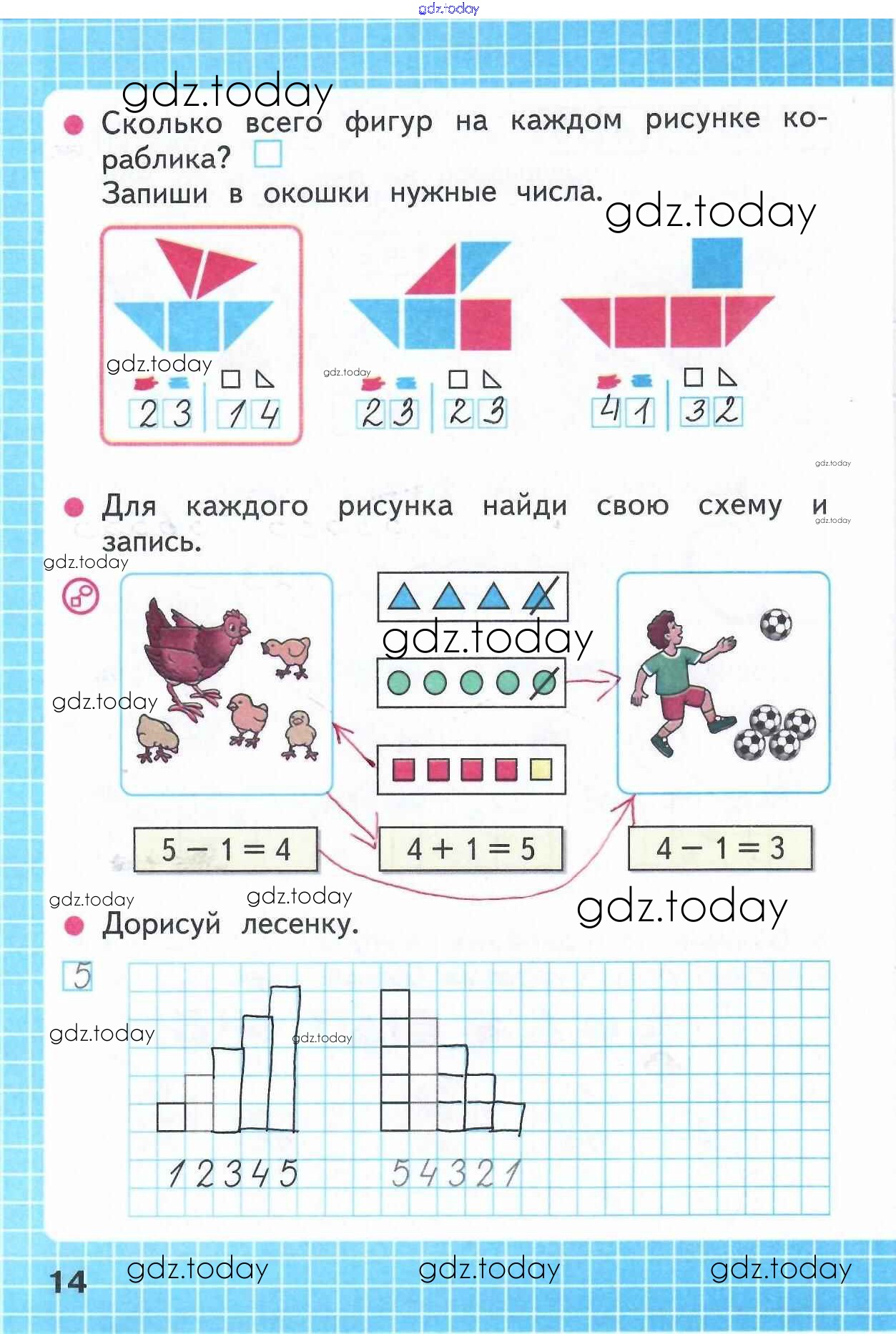 На страницах сайта gdz.today вы найдете учебный и вспомогательный материал, направленный на улучшения знаний школьной программы. ГДЗ - онлайн мир знаний Решение к части 1 (Страницы) 14 Рабочей тетради по Математике для 1 класса Моро, Волкова Просвещение Школа России 2016