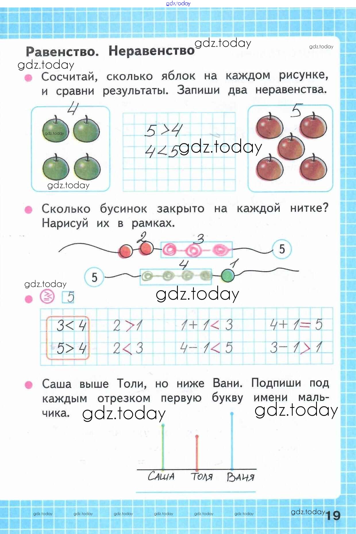 На страницах сайта gdz.today вы найдете учебный и вспомогательный материал, направленный на улучшения знаний школьной программы. ГДЗ - онлайн мир знаний Решение к части 1 (Страницы) 19 Рабочей тетради по Математике для 1 класса Моро, Волкова Просвещение Школа России 2016