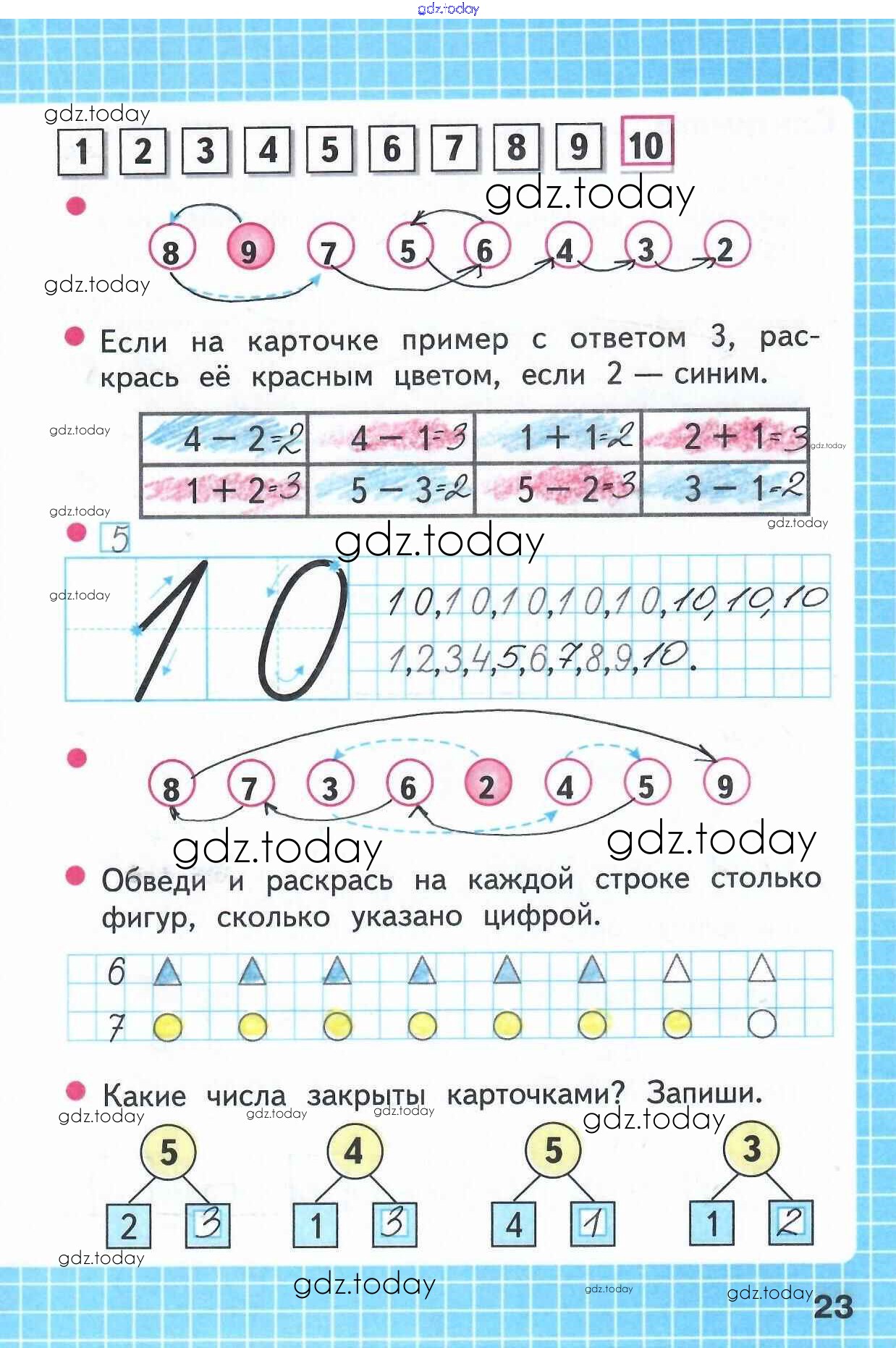 На страницах сайта gdz.today вы найдете учебный и вспомогательный материал, направленный на улучшения знаний школьной программы. ГДЗ - онлайн мир знаний Решение к части 1 (Страницы) 23 Рабочей тетради по Математике для 1 класса Моро, Волкова Просвещение Школа России 2016