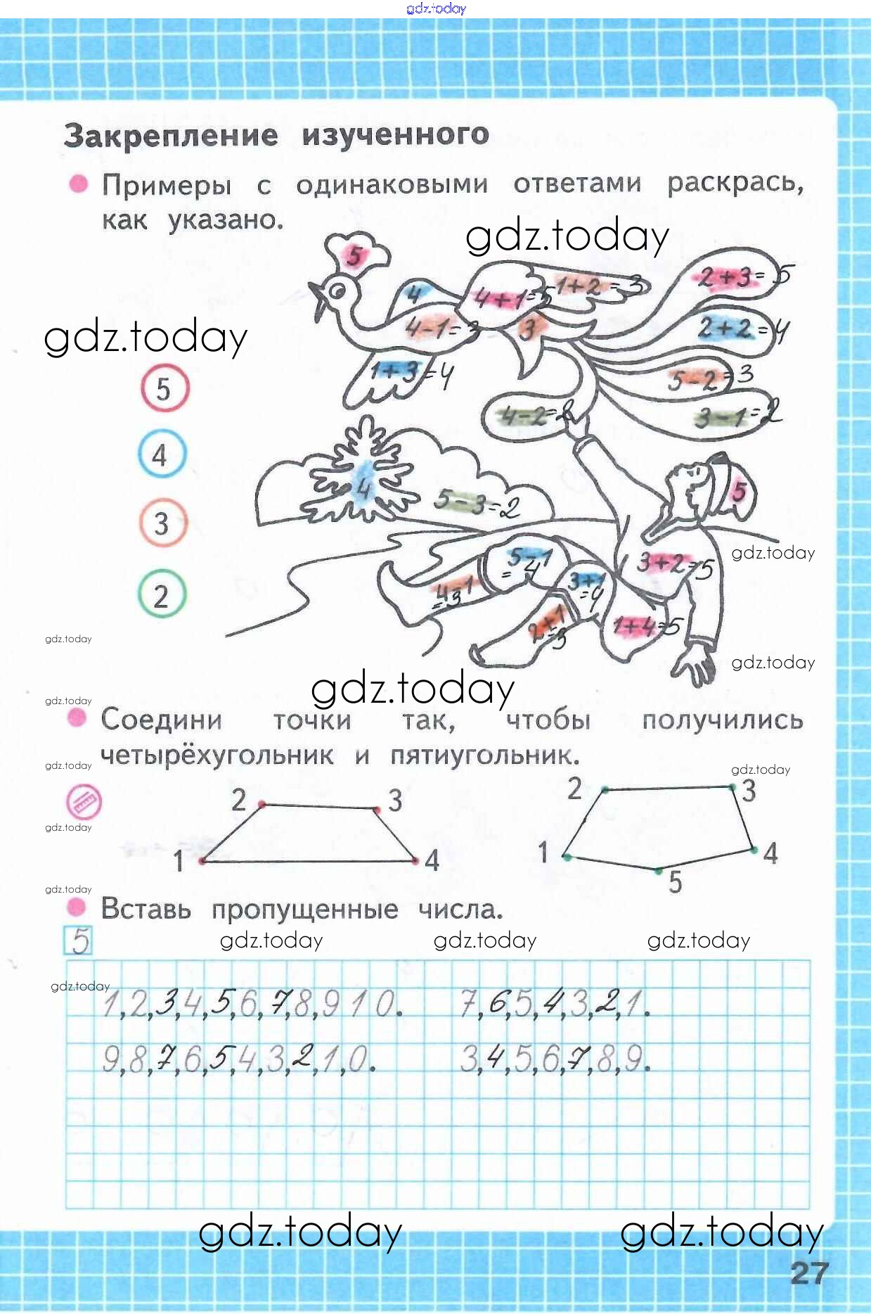На страницах сайта gdz.today вы найдете учебный и вспомогательный материал, направленный на улучшения знаний школьной программы. ГДЗ - онлайн мир знаний Решение к части 1 (Страницы) 27 Рабочей тетради по Математике для 1 класса Моро, Волкова Просвещение Школа России 2016