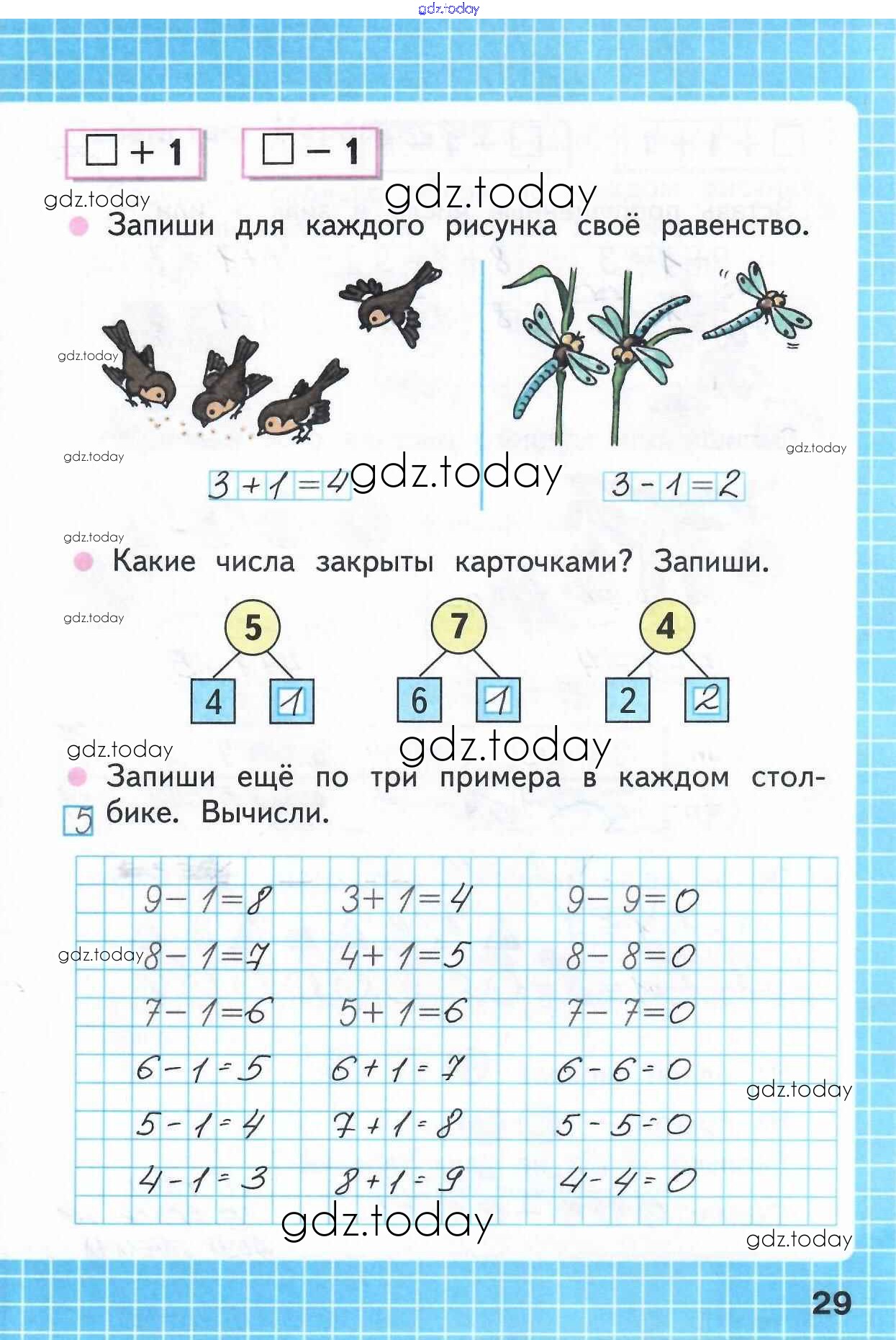 На страницах сайта gdz.today вы найдете учебный и вспомогательный материал, направленный на улучшения знаний школьной программы. ГДЗ - онлайн мир знаний Решение к части 1 (Страницы) 29 Рабочей тетради по Математике для 1 класса Моро, Волкова Просвещение Школа России 2016
