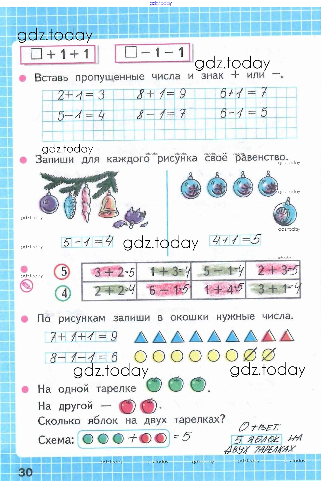 На страницах сайта gdz.today вы найдете учебный и вспомогательный материал, направленный на улучшения знаний школьной программы. ГДЗ - онлайн мир знаний Решение к части 1 (Страницы) 30 Рабочей тетради по Математике для 1 класса Моро, Волкова Просвещение Школа России 2016