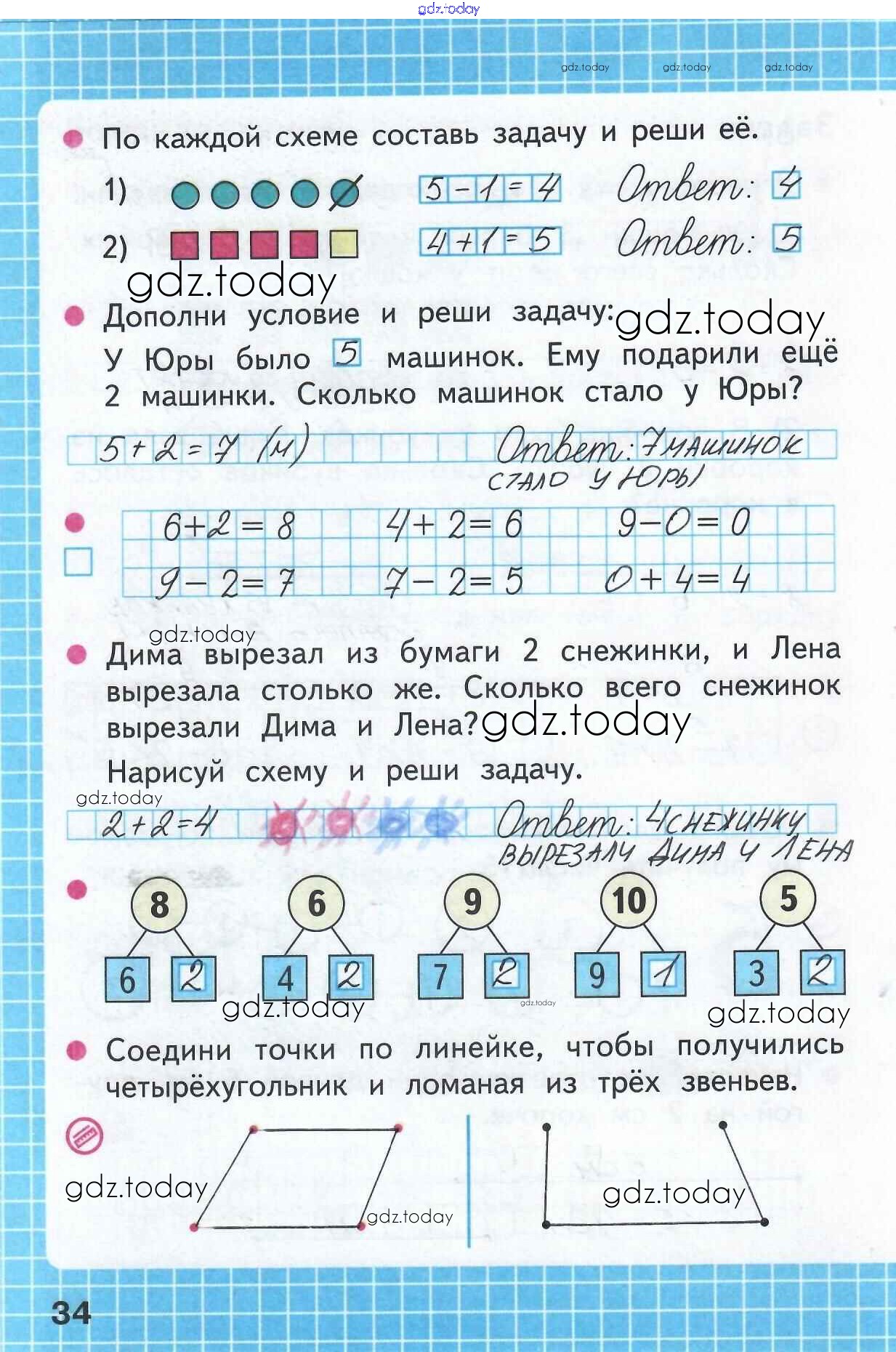 На страницах сайта gdz.today вы найдете учебный и вспомогательный материал, направленный на улучшения знаний школьной программы. ГДЗ - онлайн мир знаний Решение к части 1 (Страницы) 34 Рабочей тетради по Математике для 1 класса Моро, Волкова Просвещение Школа России 2016