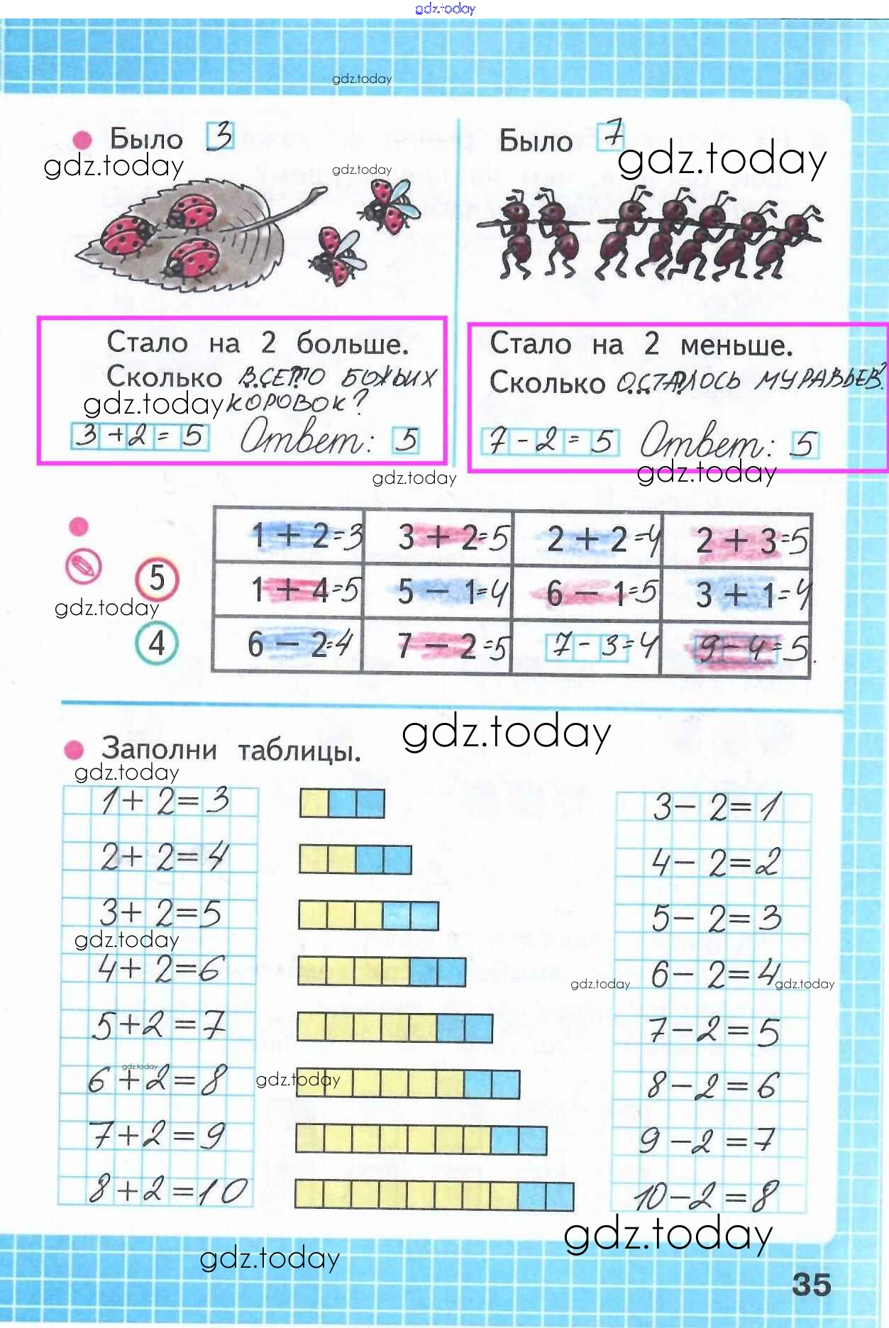 На страницах сайта gdz.today вы найдете учебный и вспомогательный материал, направленный на улучшения знаний школьной программы. ГДЗ - онлайн мир знаний Решение к части 1 (Страницы) 35 Рабочей тетради по Математике для 1 класса Моро, Волкова Просвещение Школа России 2016