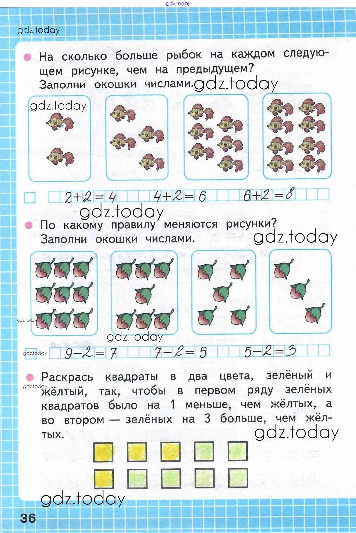 На страницах сайта gdz.today вы найдете учебный и вспомогательный материал, направленный на улучшения знаний школьной программы. ГДЗ - онлайн мир знаний Решение к части 1 (Страницы) 36 Рабочей тетради по Математике для 1 класса Моро, Волкова Просвещение Школа России 2016