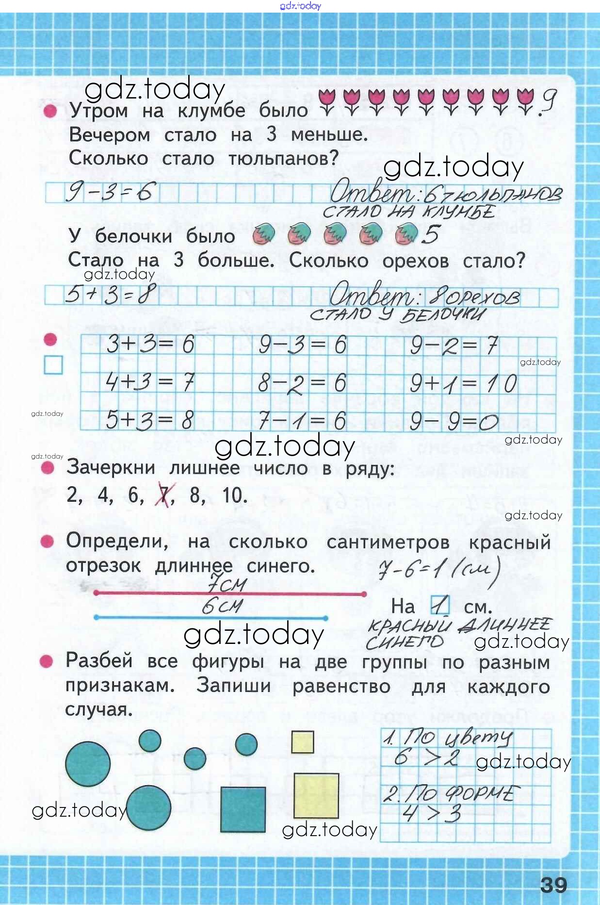 На страницах сайта gdz.today вы найдете учебный и вспомогательный материал, направленный на улучшения знаний школьной программы. ГДЗ - онлайн мир знаний Решение к части 1 (Страницы) 39 Рабочей тетради по Математике для 1 класса Моро, Волкова Просвещение Школа России 2016