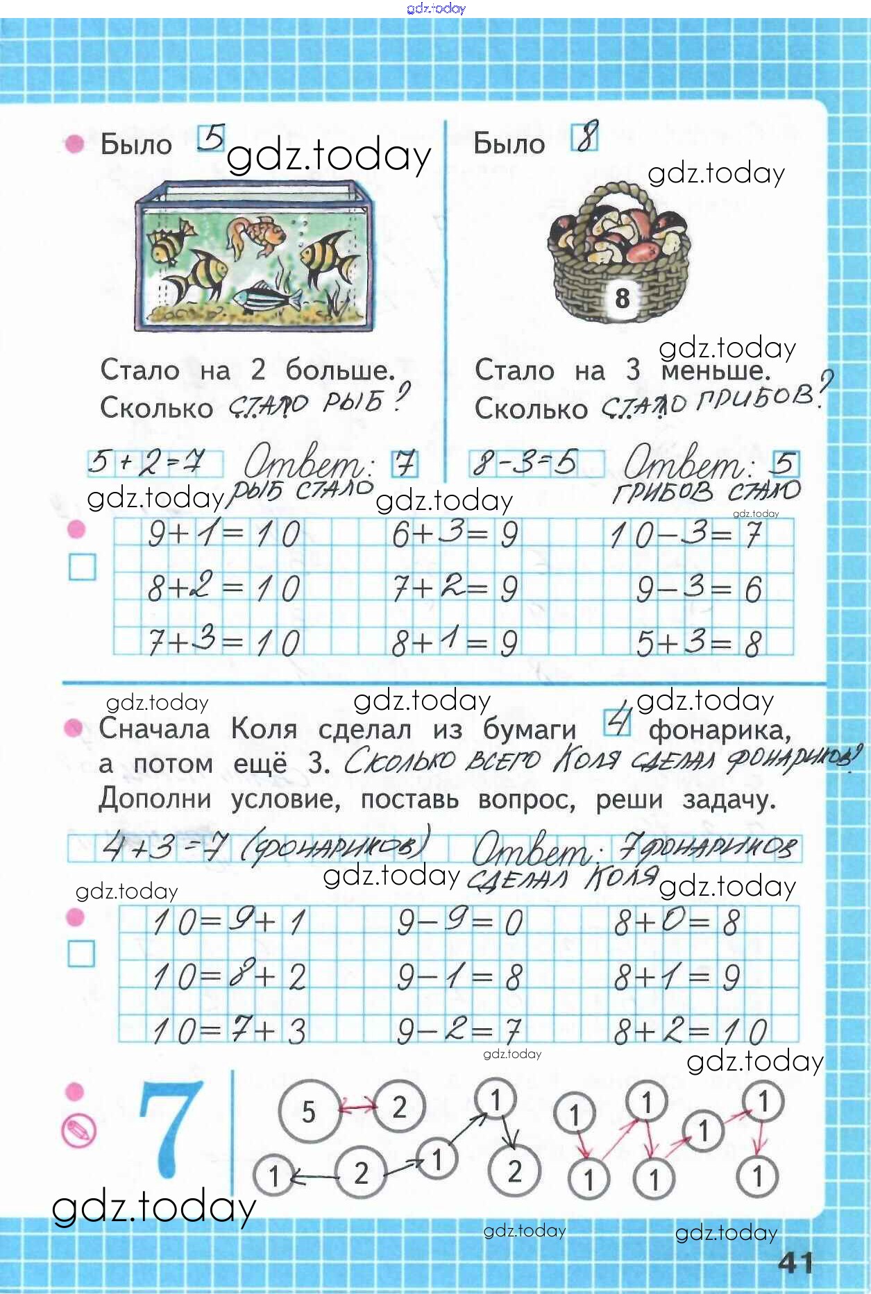 На страницах сайта gdz.today вы найдете учебный и вспомогательный материал, направленный на улучшения знаний школьной программы. ГДЗ - онлайн мир знаний Решение к части 1 (Страницы) 41 Рабочей тетради по Математике для 1 класса Моро, Волкова Просвещение Школа России 2016