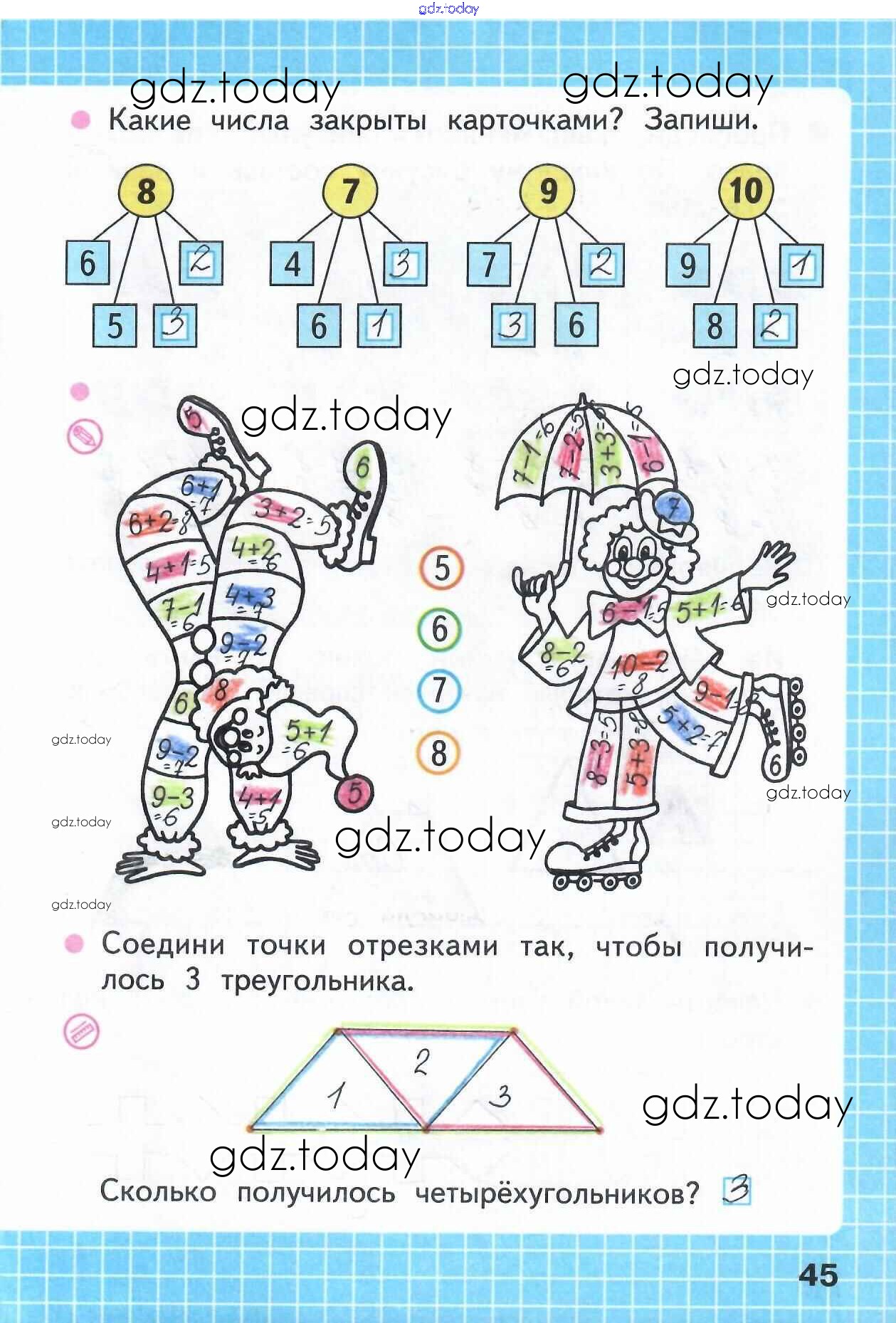На страницах сайта gdz.today вы найдете учебный и вспомогательный материал, направленный на улучшения знаний школьной программы. ГДЗ - онлайн мир знаний Решение к части 1 (Страницы) 45 Рабочей тетради по Математике для 1 класса Моро, Волкова Просвещение Школа России 2016