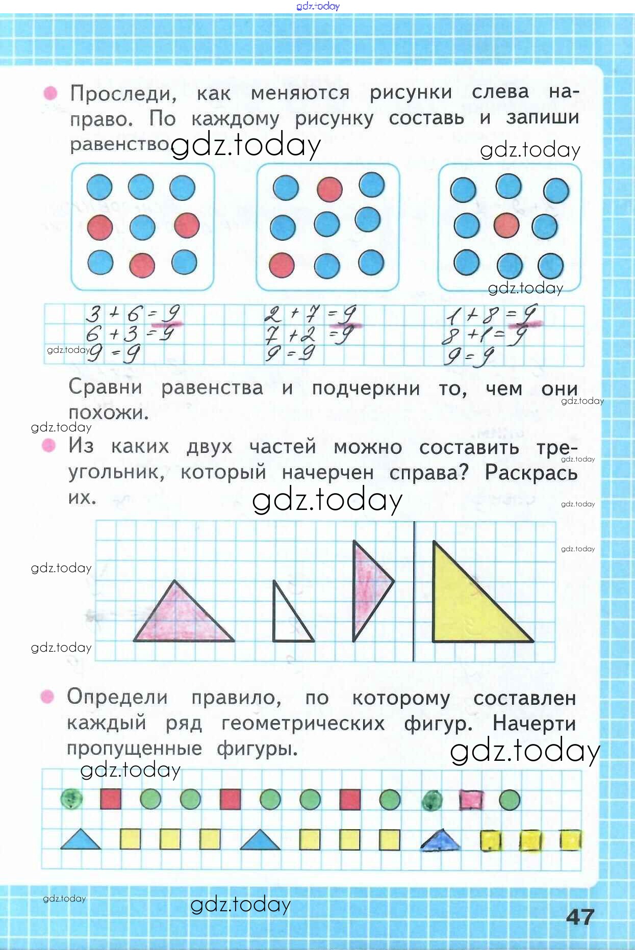 На страницах сайта gdz.today вы найдете учебный и вспомогательный материал, направленный на улучшения знаний школьной программы. ГДЗ - онлайн мир знаний Решение к части 1 (Страницы) 47 Рабочей тетради по Математике для 1 класса Моро, Волкова Просвещение Школа России 2016