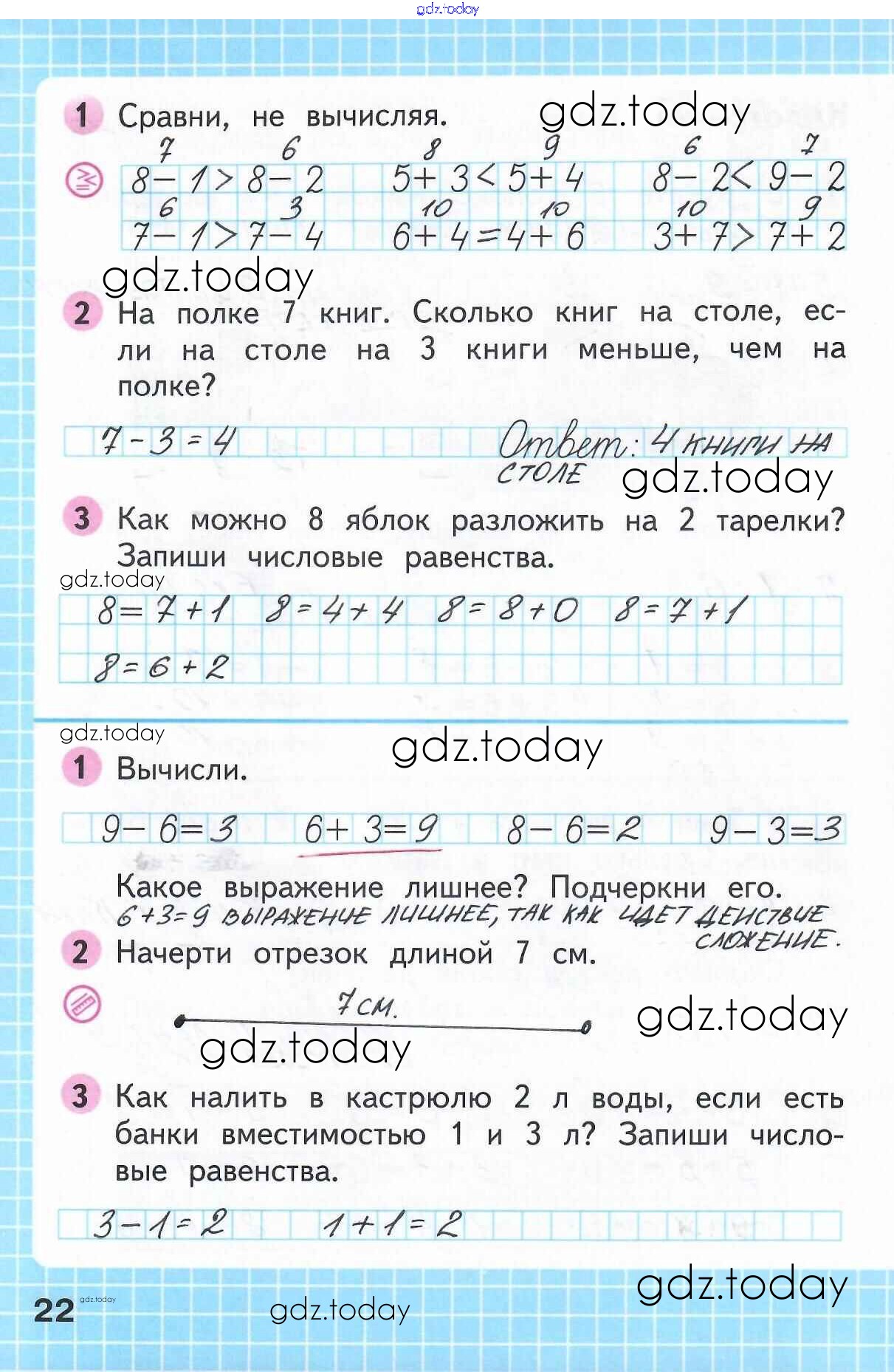 На страницах сайта gdz.today вы найдете учебный и вспомогательный материал, направленный на улучшения знаний школьной программы. ГДЗ - онлайн мир знаний Решение к части 2 (Страницы) 22 Рабочей тетради по Математике для 1 класса Моро, Волкова Просвещение Школа России 2016