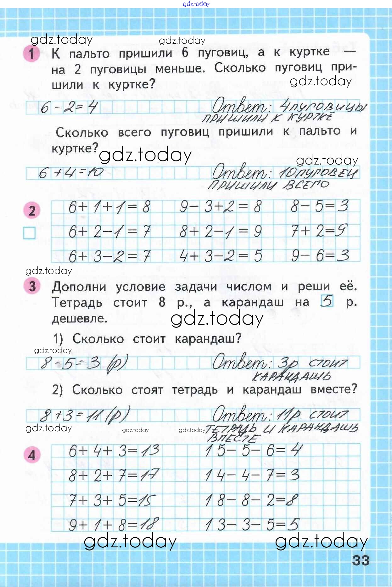 На страницах сайта gdz.today вы найдете учебный и вспомогательный материал, направленный на улучшения знаний школьной программы. ГДЗ - онлайн мир знаний Решение к части 2 (Страницы) 33 Рабочей тетради по Математике для 1 класса Моро, Волкова Просвещение Школа России 2016