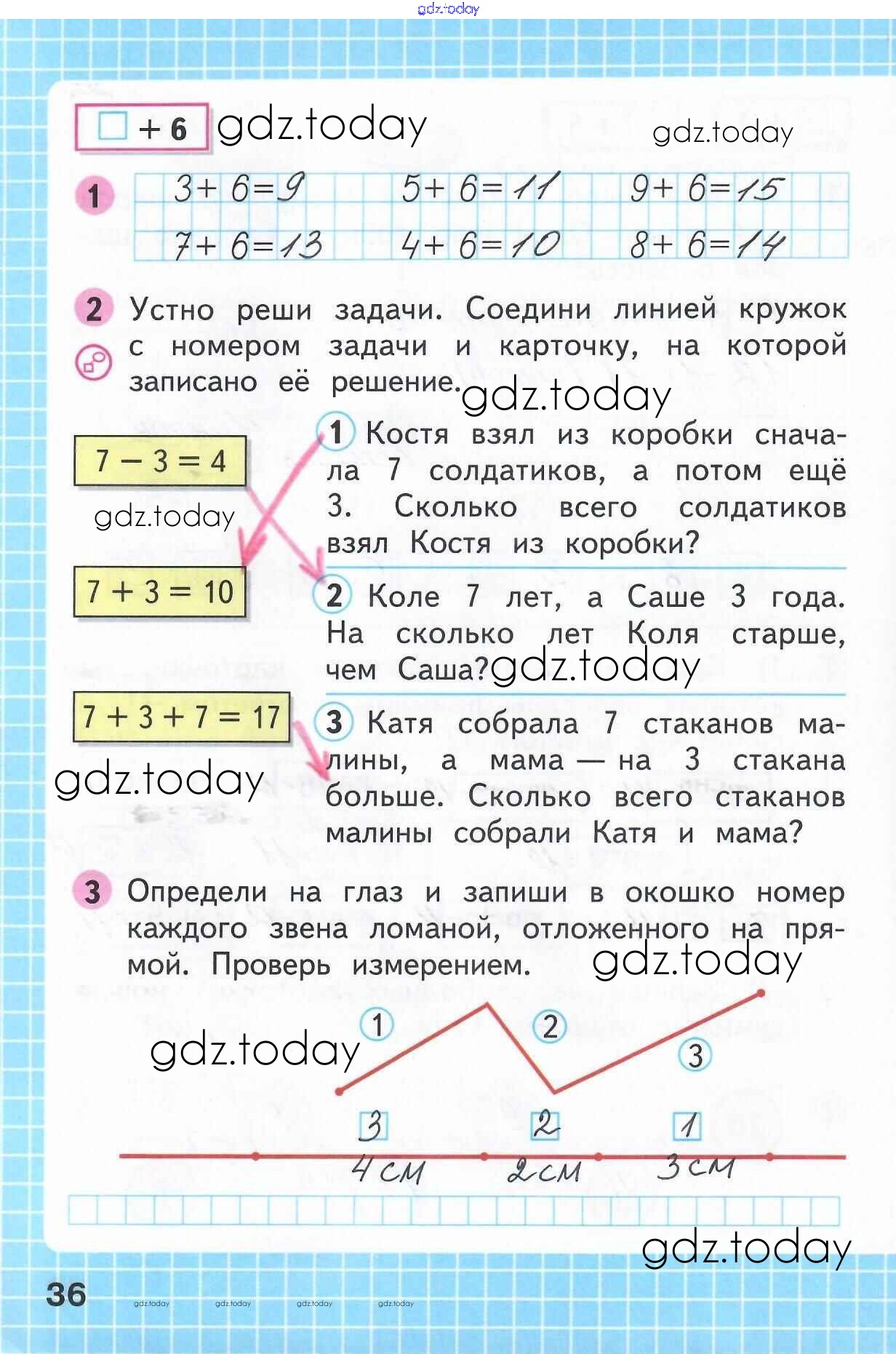 На страницах сайта gdz.today вы найдете учебный и вспомогательный материал, направленный на улучшения знаний школьной программы. ГДЗ - онлайн мир знаний Решение к части 2 (Страницы) 36 Рабочей тетради по Математике для 1 класса Моро, Волкова Просвещение Школа России 2016