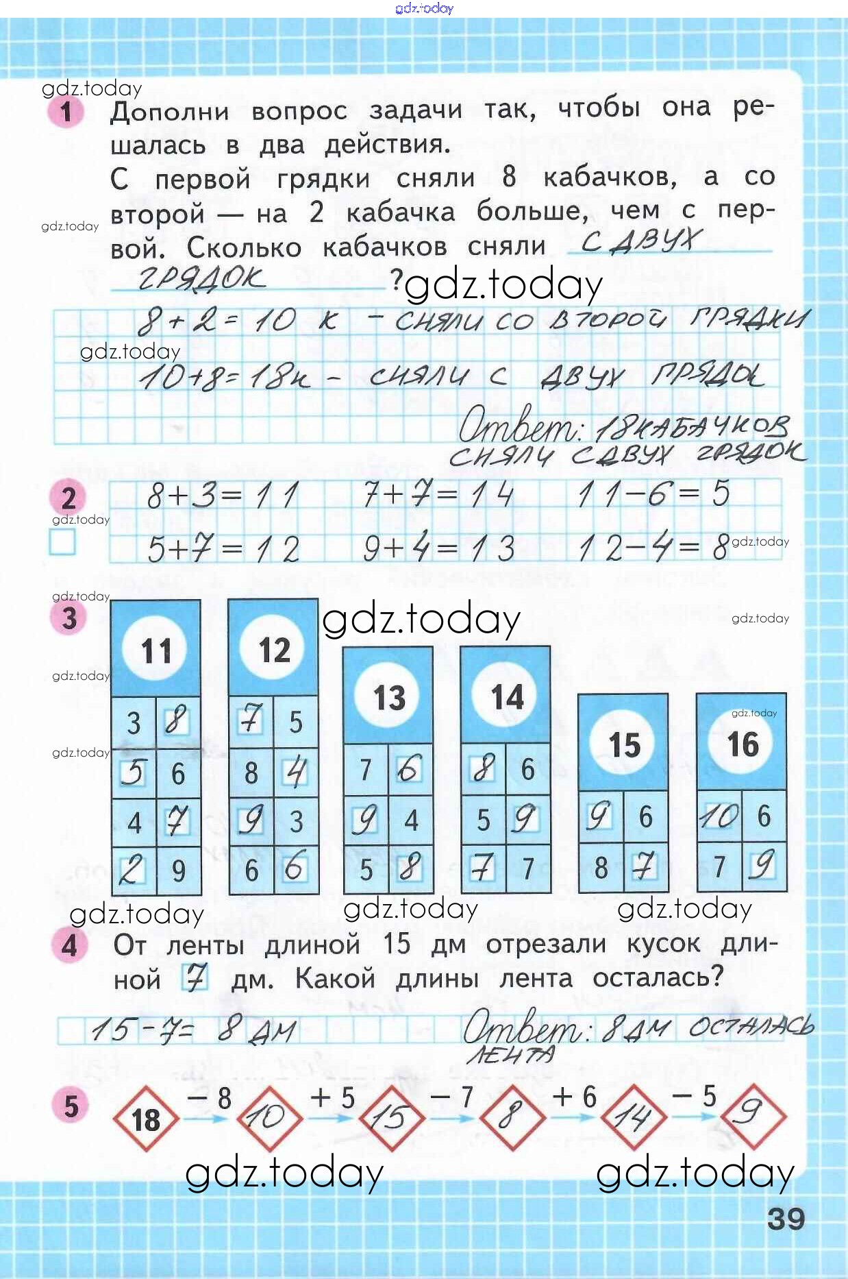 На страницах сайта gdz.today вы найдете учебный и вспомогательный материал, направленный на улучшения знаний школьной программы. ГДЗ - онлайн мир знаний Решение к части 2 (Страницы) 39 Рабочей тетради по Математике для 1 класса Моро, Волкова Просвещение Школа России 2016