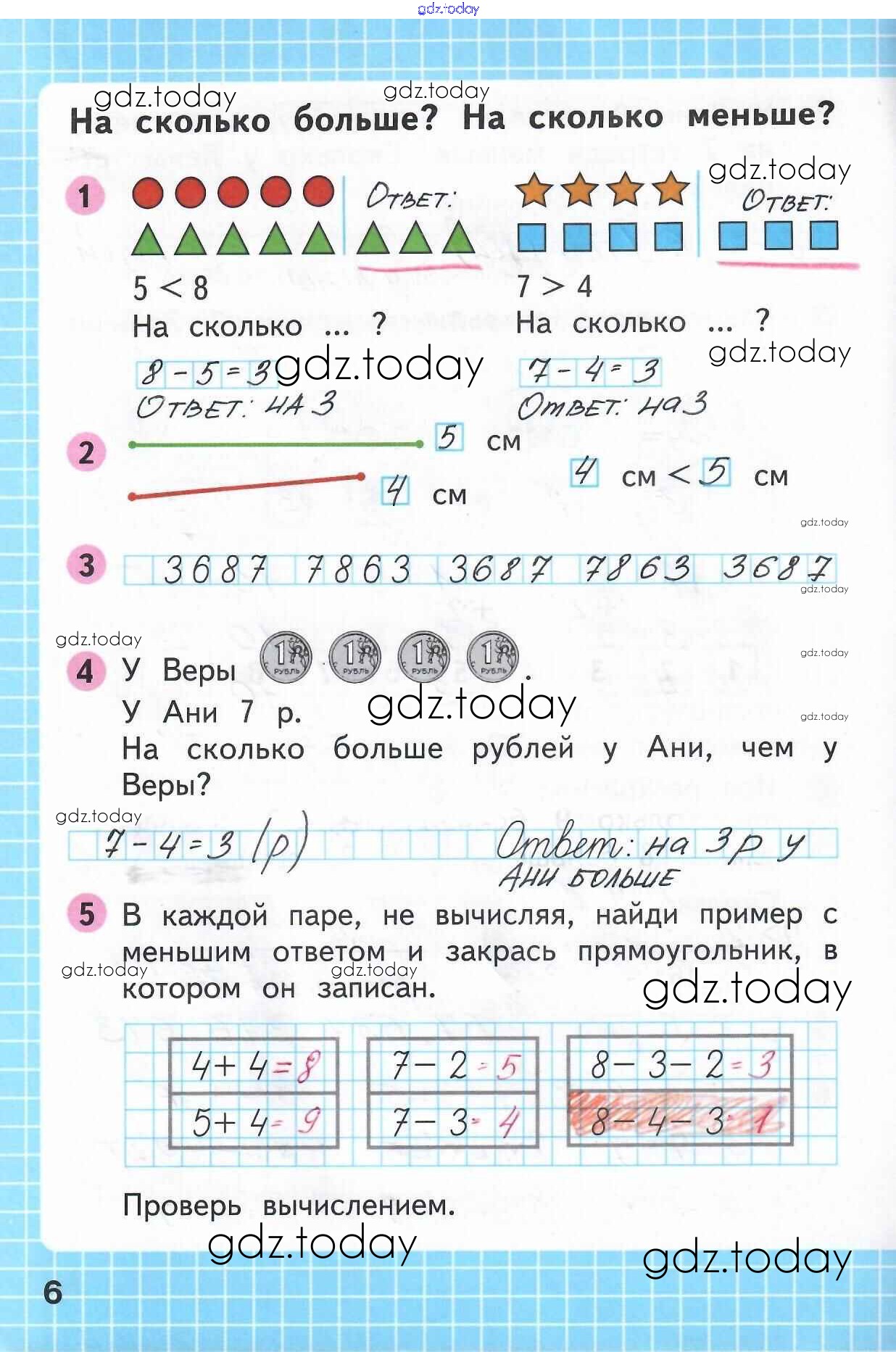 На страницах сайта gdz.today вы найдете учебный и вспомогательный материал, направленный на улучшения знаний школьной программы. ГДЗ - онлайн мир знаний Решение к части 2 (Страницы) 6 Рабочей тетради по Математике для 1 класса Моро, Волкова Просвещение Школа России 2016