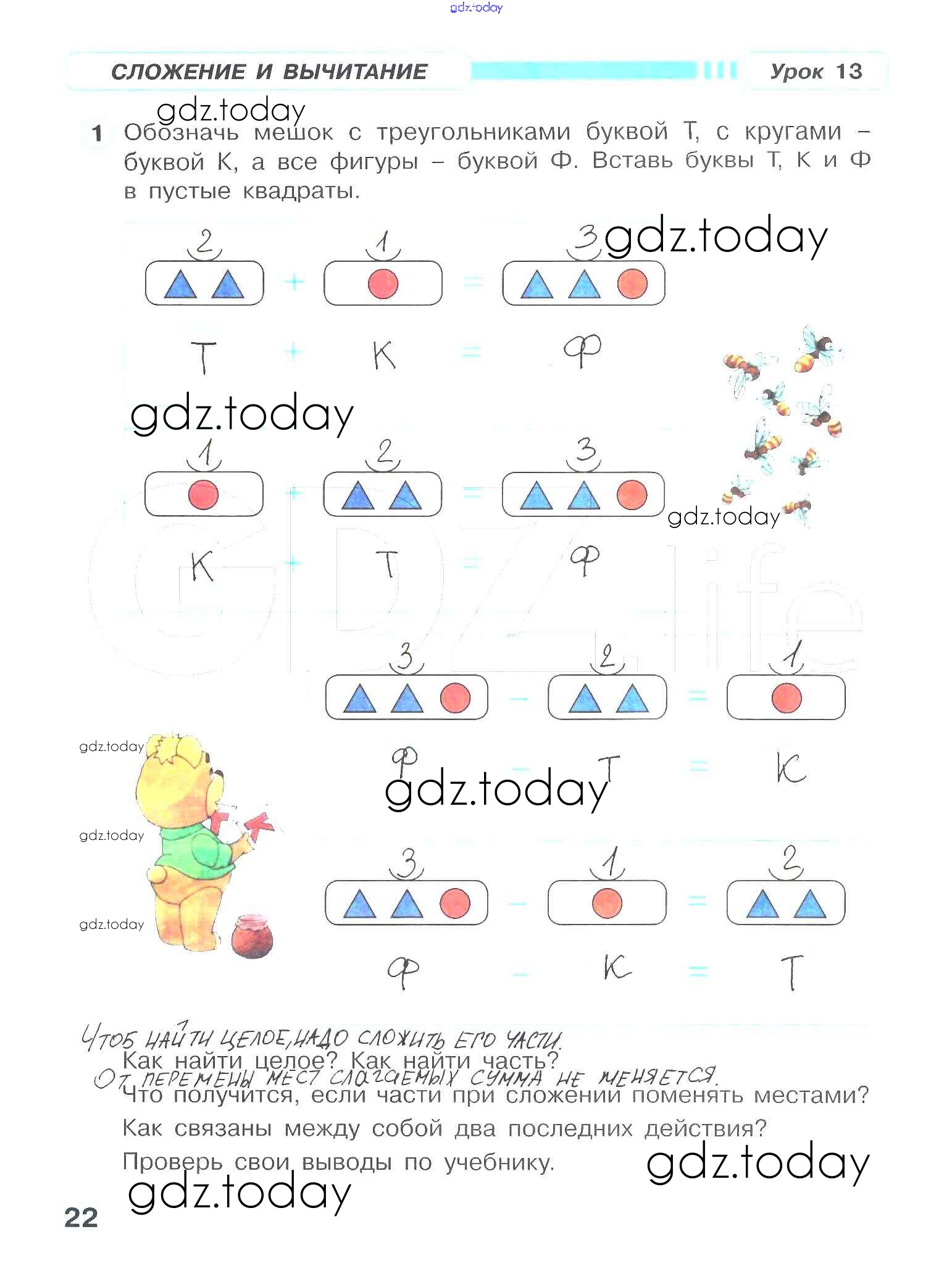 На страницах сайта gdz.today вы найдете учебный и вспомогательный материал, направленный на улучшения знаний школьной программы. ГДЗ - онлайн мир знаний Решение к части 1. Страницы 22 Рабочей тетради по Математике для 1 класса Петерсон Ювента Учусь учиться 2016
