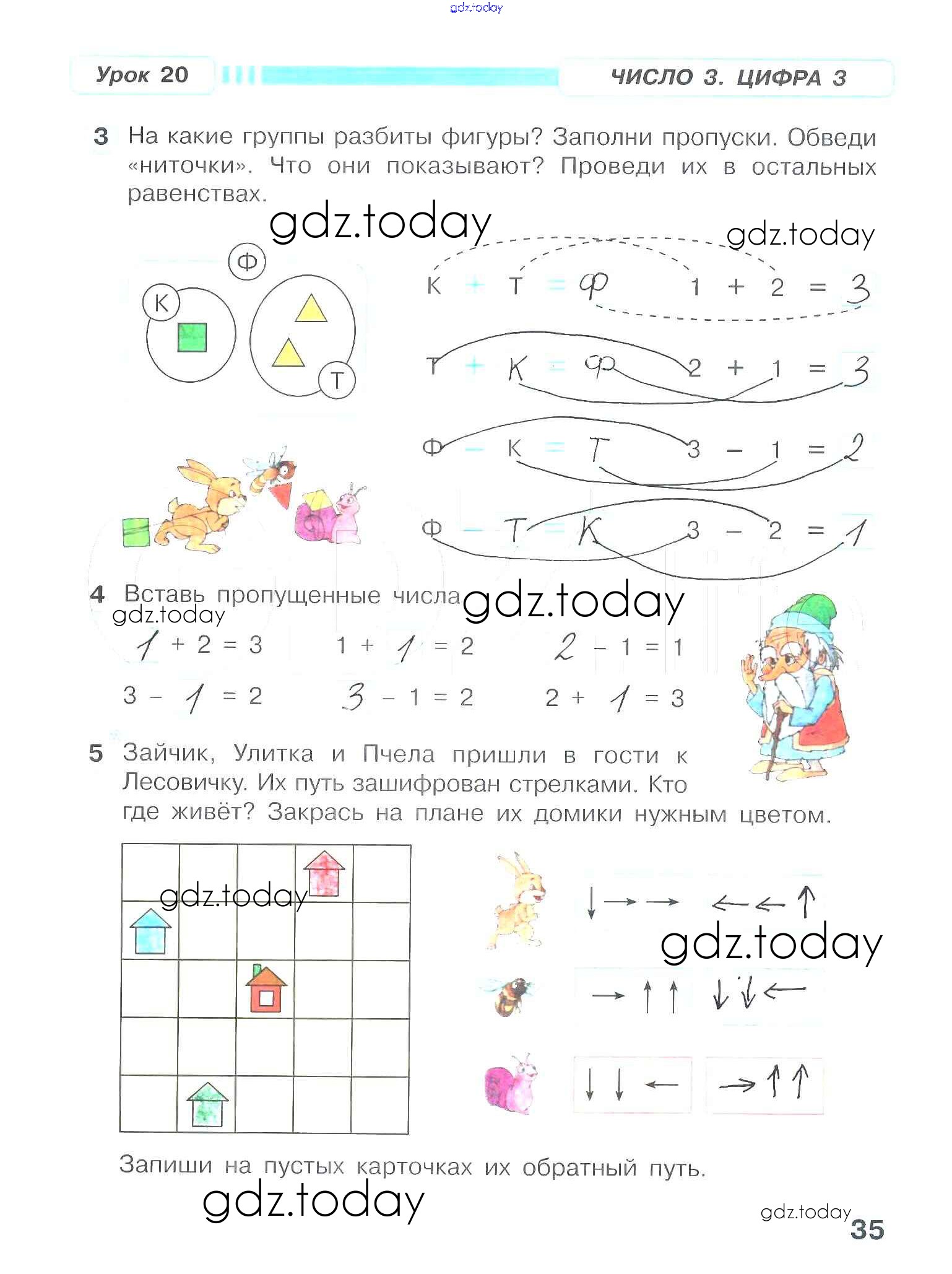 На страницах сайта gdz.today вы найдете учебный и вспомогательный материал, направленный на улучшения знаний школьной программы. ГДЗ - онлайн мир знаний Решение к части 1. Страницы 35 Рабочей тетради по Математике для 1 класса Петерсон Ювента Учусь учиться 2016