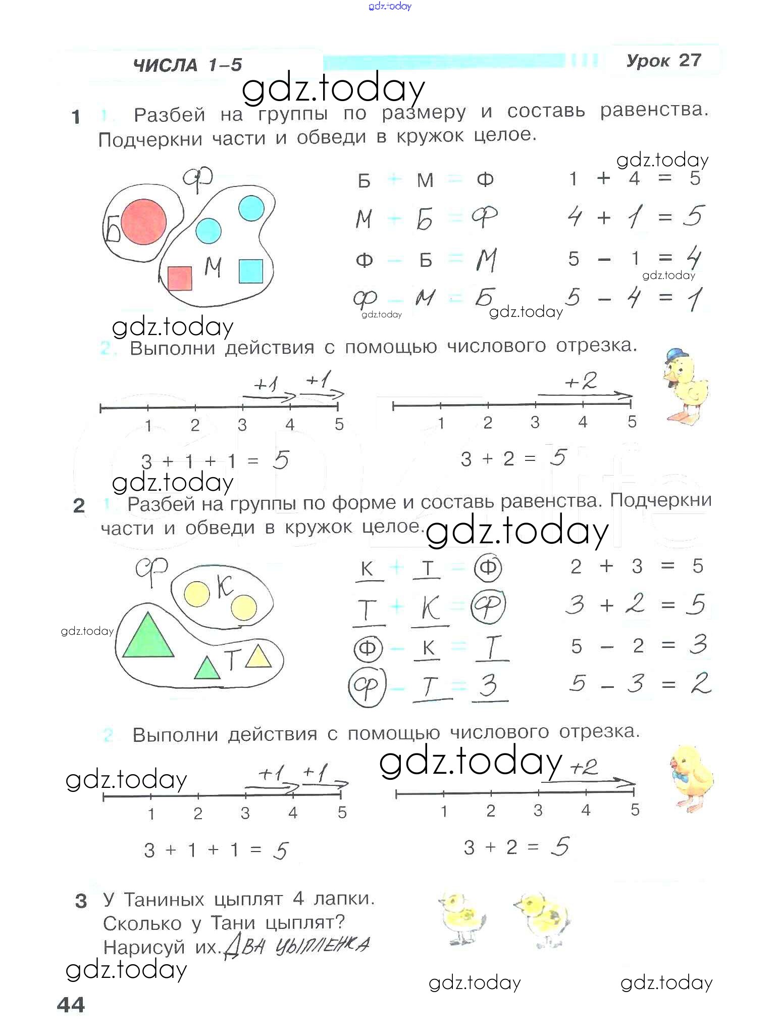 На страницах сайта gdz.today вы найдете учебный и вспомогательный материал, направленный на улучшения знаний школьной программы. ГДЗ - онлайн мир знаний Решение к части 1. Страницы 44 Рабочей тетради по Математике для 1 класса Петерсон Ювента Учусь учиться 2016