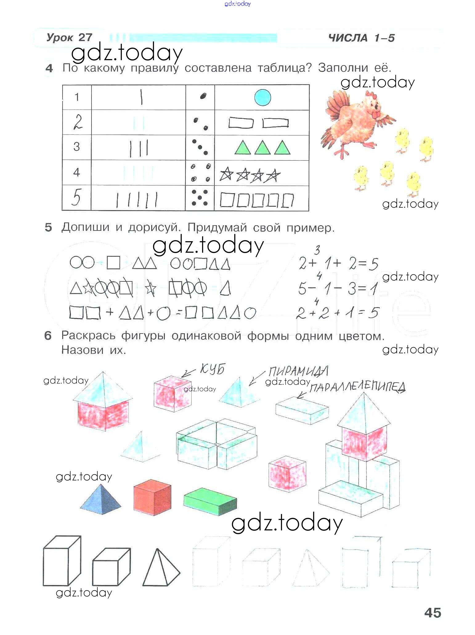 На страницах сайта gdz.today вы найдете учебный и вспомогательный материал, направленный на улучшения знаний школьной программы. ГДЗ - онлайн мир знаний Решение к части 1. Страницы 45 Рабочей тетради по Математике для 1 класса Петерсон Ювента Учусь учиться 2016