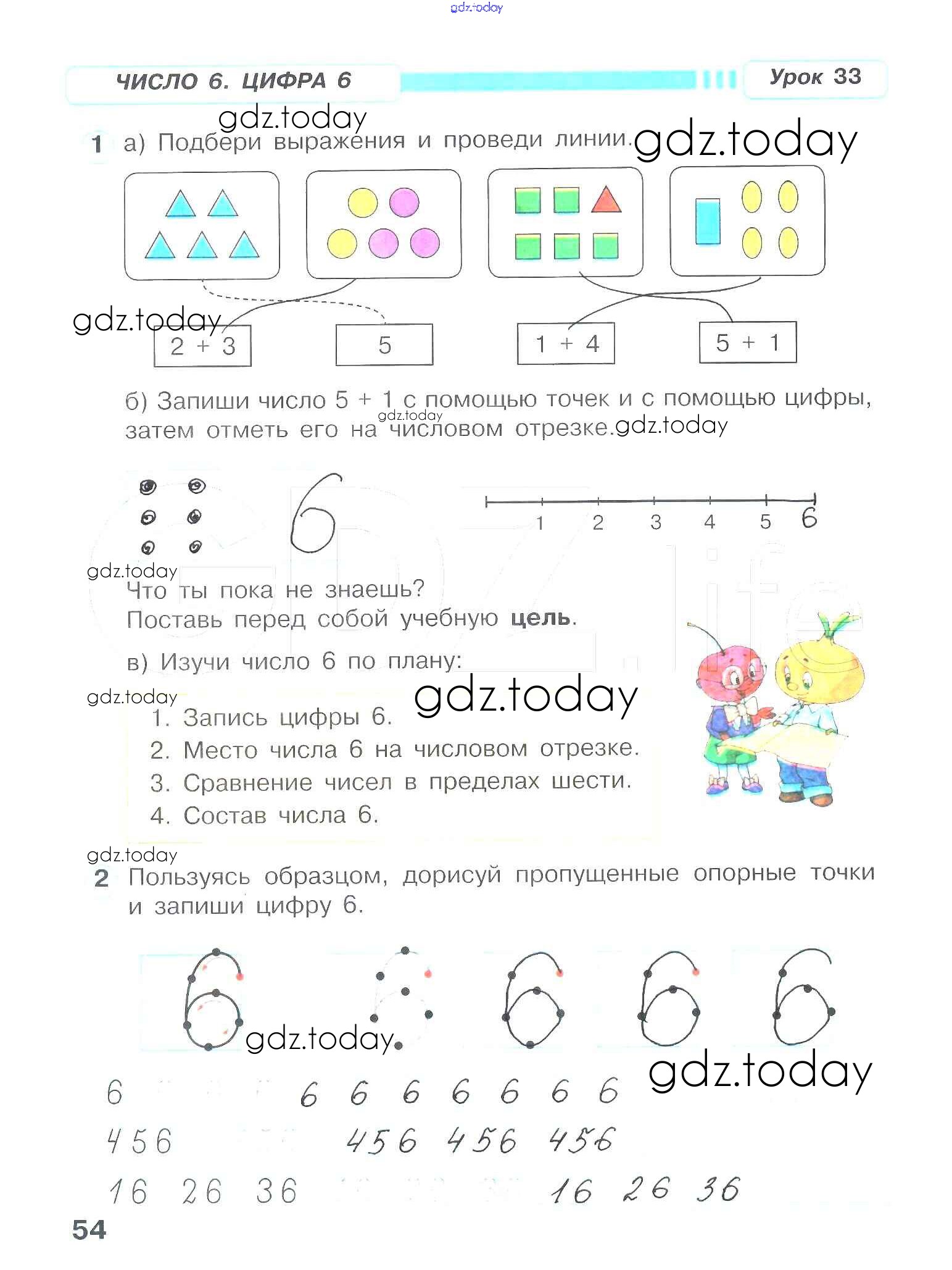 На страницах сайта gdz.today вы найдете учебный и вспомогательный материал, направленный на улучшения знаний школьной программы. ГДЗ - онлайн мир знаний Решение к части 1. Страницы 54 Рабочей тетради по Математике для 1 класса Петерсон Ювента Учусь учиться 2016