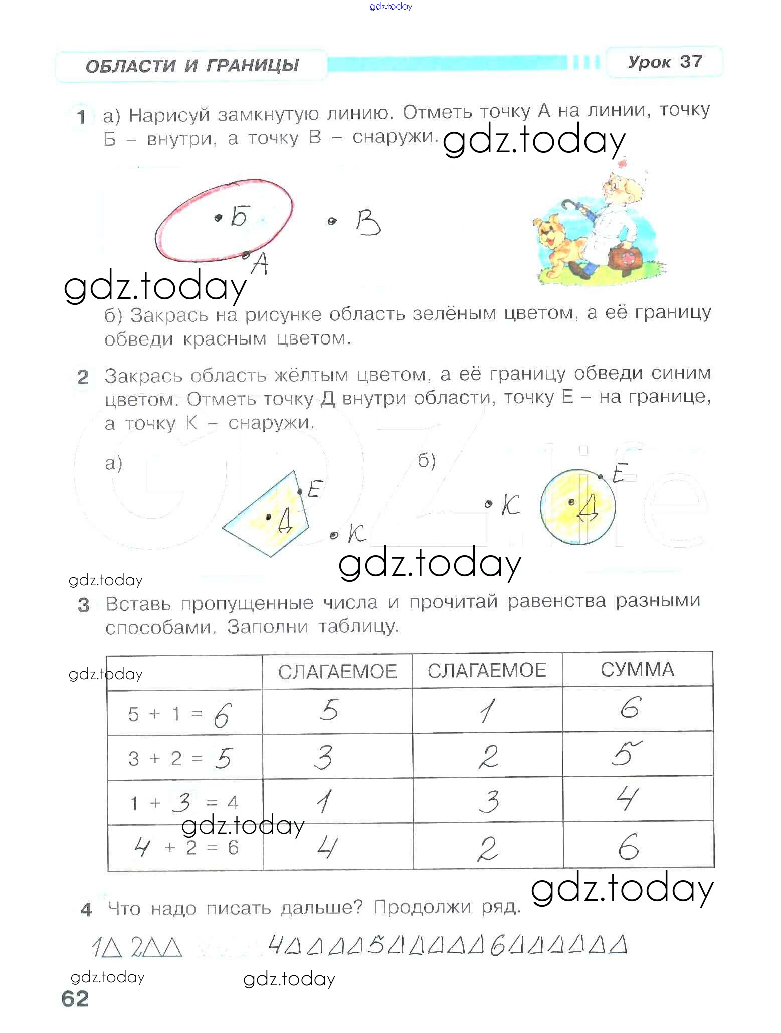 На страницах сайта gdz.today вы найдете учебный и вспомогательный материал, направленный на улучшения знаний школьной программы. ГДЗ - онлайн мир знаний Решение к части 1. Страницы 62 Рабочей тетради по Математике для 1 класса Петерсон Ювента Учусь учиться 2016