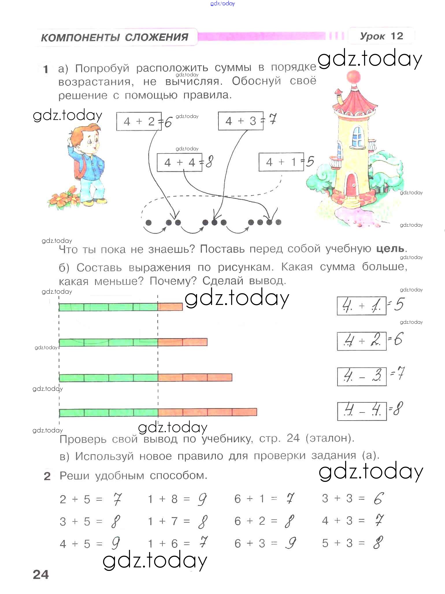 На страницах сайта gdz.today вы найдете учебный и вспомогательный материал, направленный на улучшения знаний школьной программы. ГДЗ - онлайн мир знаний Решение к части 2. Страницы 24 Рабочей тетради по Математике для 1 класса Петерсон Ювента Учусь учиться 2016