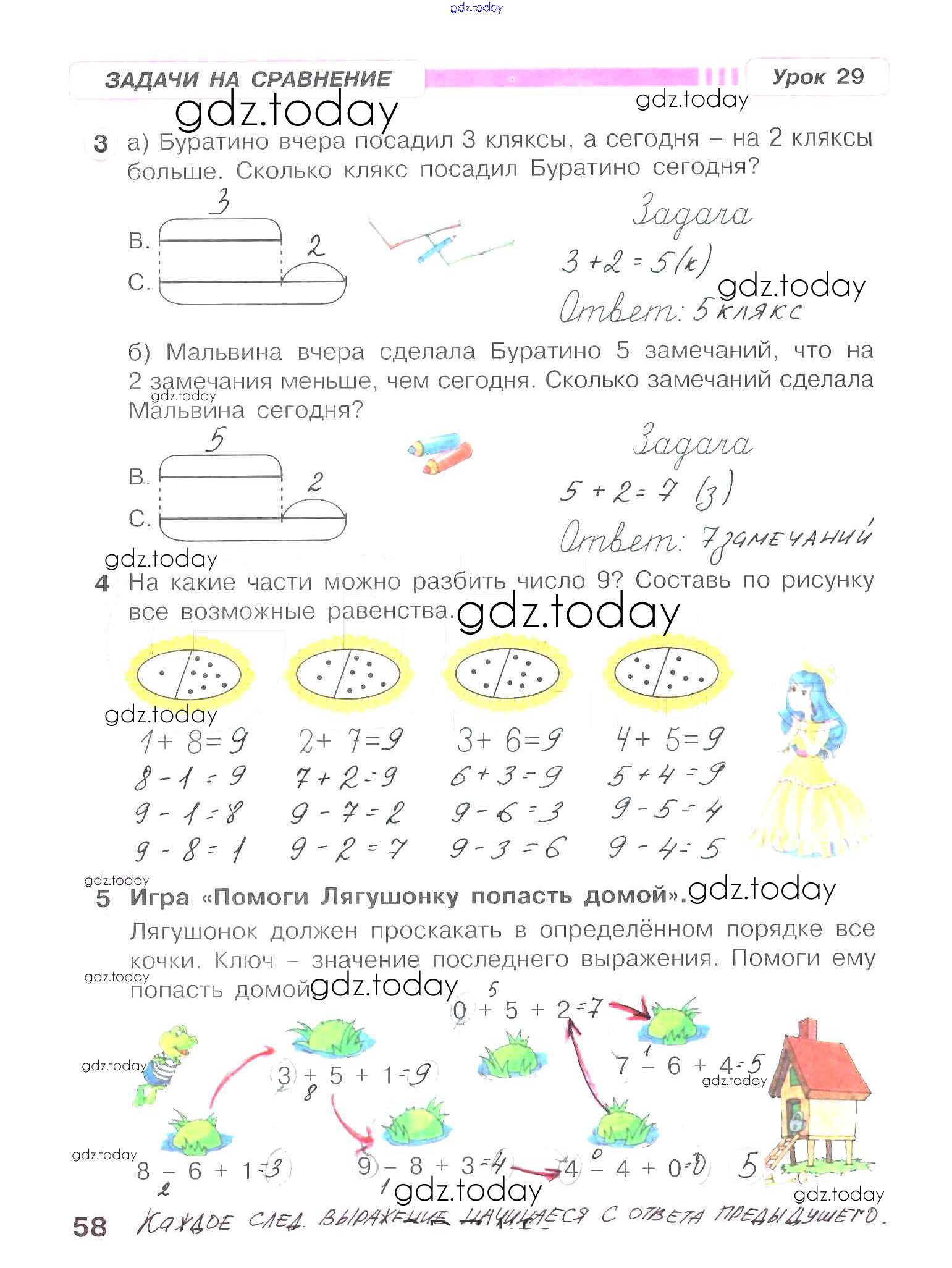 На страницах сайта gdz.today вы найдете учебный и вспомогательный материал, направленный на улучшения знаний школьной программы. ГДЗ - онлайн мир знаний Решение к части 2. Страницы 58 Рабочей тетради по Математике для 1 класса Петерсон Ювента Учусь учиться 2016
