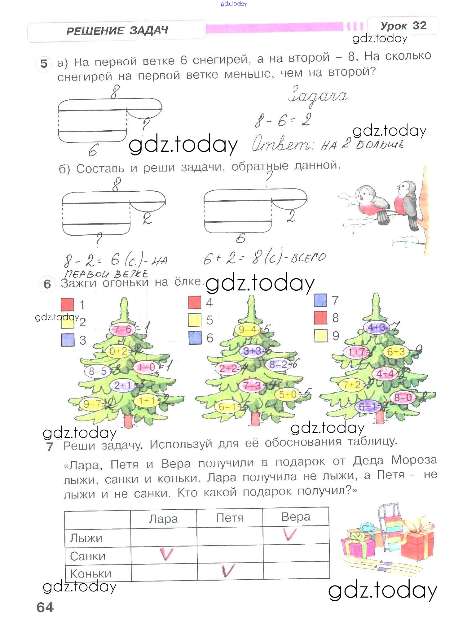 На страницах сайта gdz.today вы найдете учебный и вспомогательный материал, направленный на улучшения знаний школьной программы. ГДЗ - онлайн мир знаний Решение к части 2. Страницы 64 Рабочей тетради по Математике для 1 класса Петерсон Ювента Учусь учиться 2016