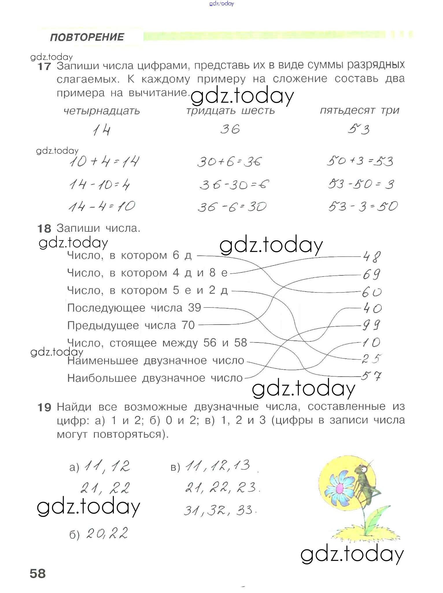 На страницах сайта gdz.today вы найдете учебный и вспомогательный материал, направленный на улучшения знаний школьной программы. ГДЗ - онлайн мир знаний Решение к части 3. Страницы 58 Рабочей тетради по Математике для 1 класса Петерсон Ювента Учусь учиться 2016
