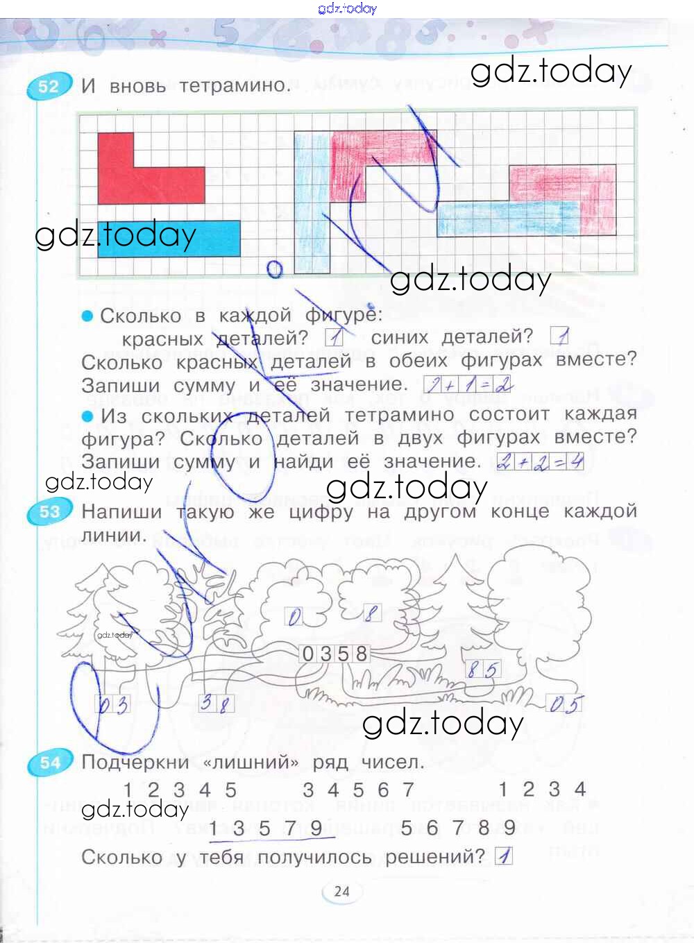 На страницах сайта gdz.today вы найдете учебный и вспомогательный материал, направленный на улучшения знаний школьной программы. ГДЗ - онлайн мир знаний Решение к части 2. Страницы 24 Рабочей тетради по Математике для 1 класса Бененсон Фёдоров 2015