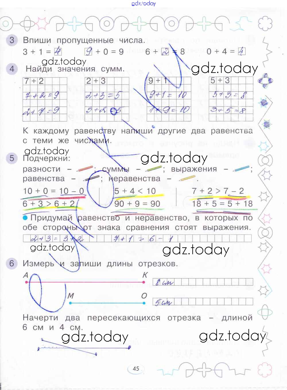 На страницах сайта gdz.today вы найдете учебный и вспомогательный материал, направленный на улучшения знаний школьной программы. ГДЗ - онлайн мир знаний Решение к части 3. Страницы 45 Рабочей тетради по Математике для 1 класса Бененсон Фёдоров 2015